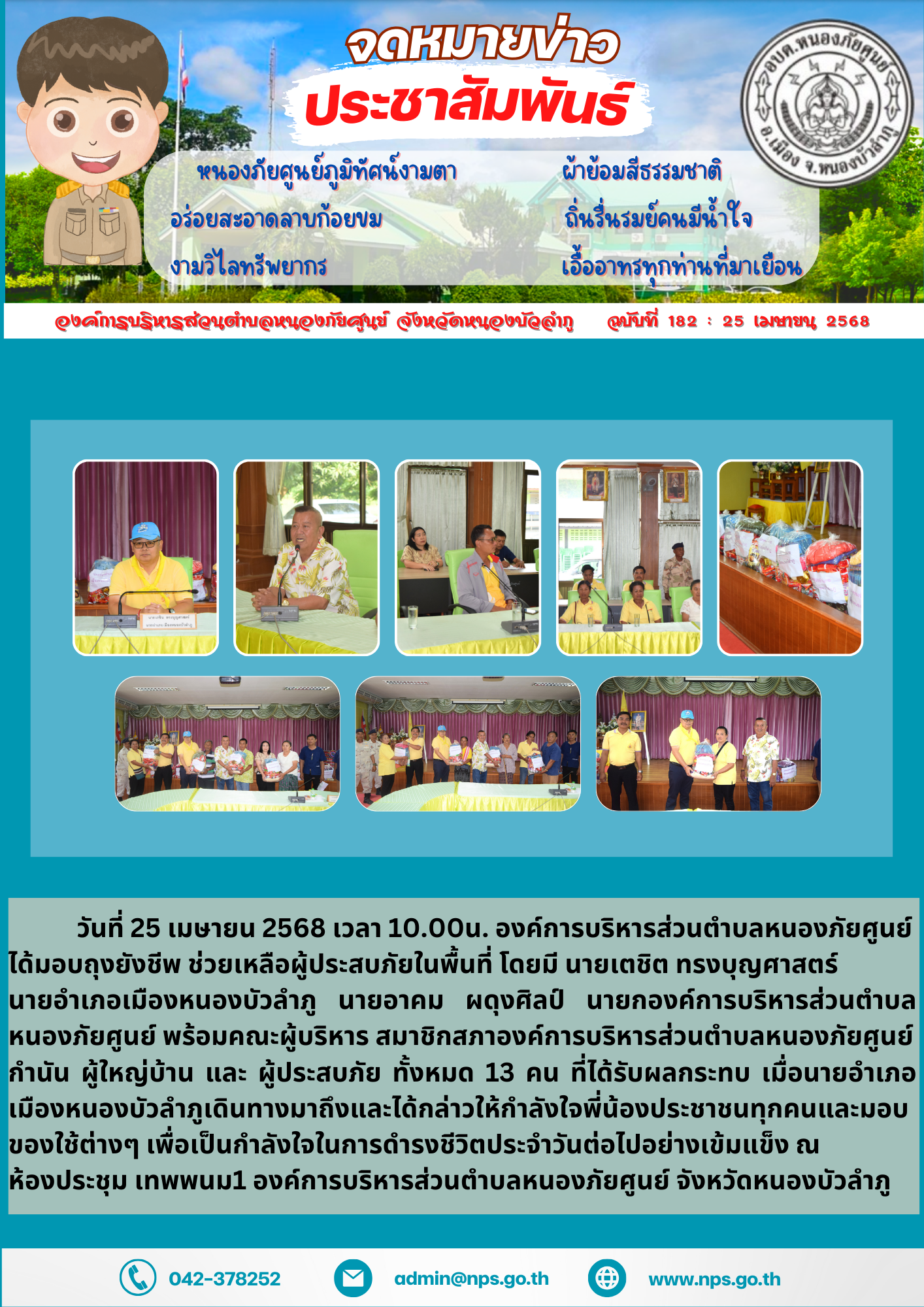 วันที่ 25 เมษายน 2568 เวลา 10.00น. องค์การบริหารส่วนตำบลหนองภัยศูนย์ ได้มอบถุงยังชีพช่วยเหลือผู้ประสบภัยในพื้นที่ โดยมี นายเตชิต ทรงบุญศาสตร์ นายอำเภอเมืองหนองบัวลำภู นายอาคม ผดุงศิลป์... [25 เมษายน 2568]