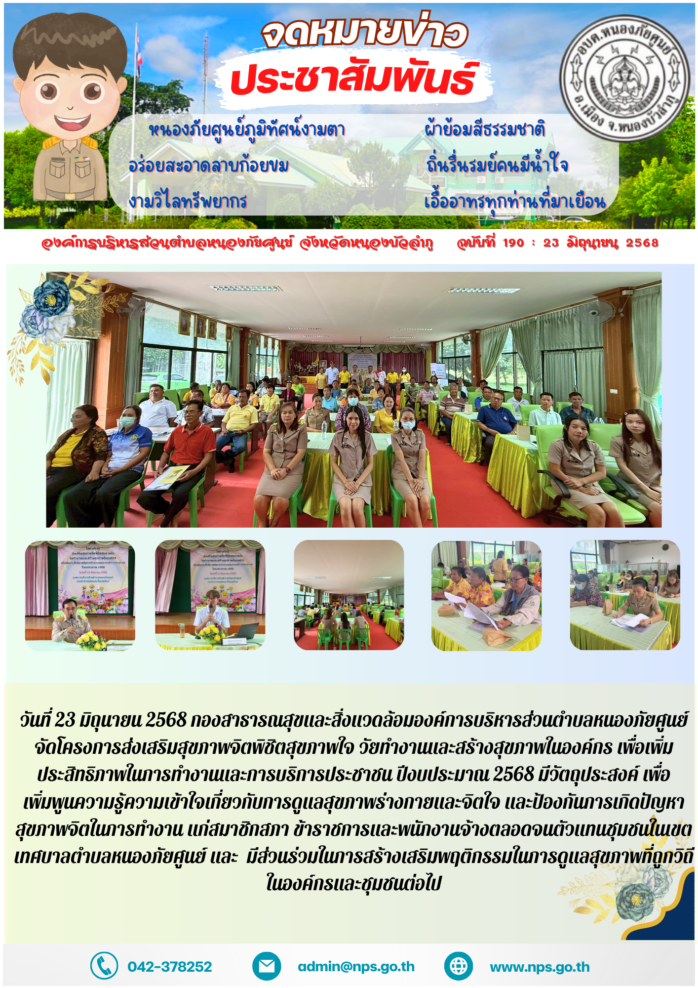 วันที่ 23 มิถุนายน 2568 กองสาธารณสุขและสิ่งแวดล้อมองค์การบริหารส่วนตำบลหนองภัยศูนย์ จัดโครงการส่งเสริมสุขภาพจิตพิชิตสุขภาพใจ วัยทำงานและสร้างสุขภาพในองค์กร เพื่อเพิ่มประสิทธิภาพในการทำงานและการบริการประชาชน... [23 มิถุนายน 2568]