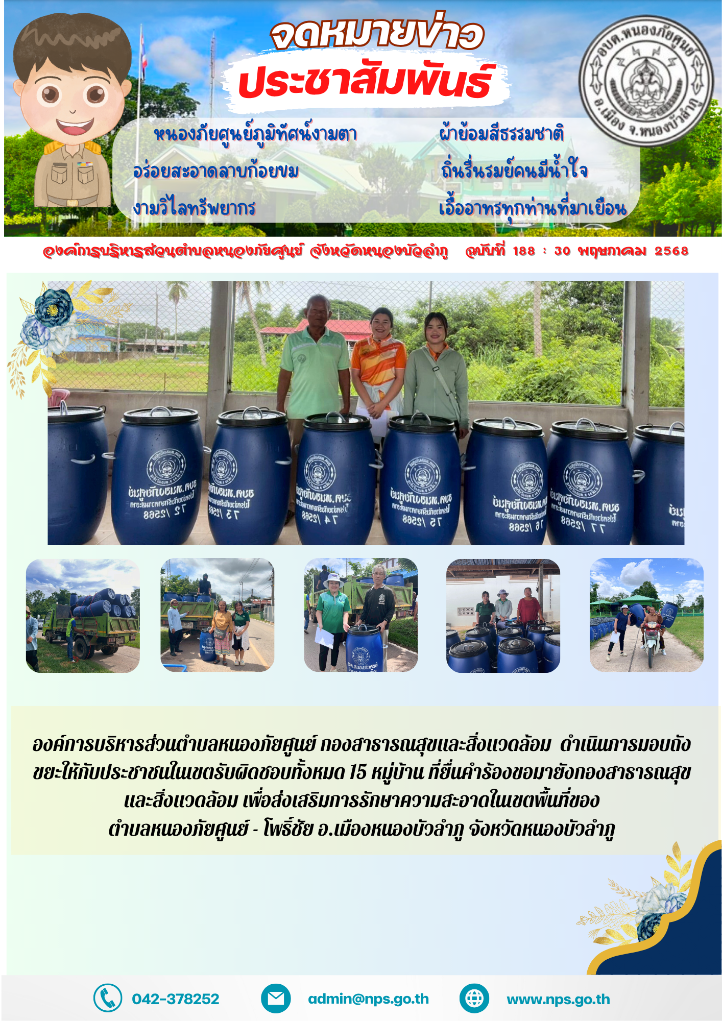 องค์การบริหารส่วนตำบลหนองภัยศูนย์ กองสาธารณสุขและสิ่งแวดล้อม ดำเนินการมอบถังขยะให้กับประชาชนในเขตรับผิดชอบทั้งหมด 15 หมู่บ้าน ที่ยื่นคำร้องขอมายังกองสาธารณสุขและสิ่งแวดล้อม... [16 มิถุนายน 2568]