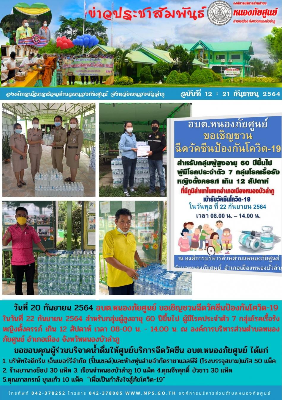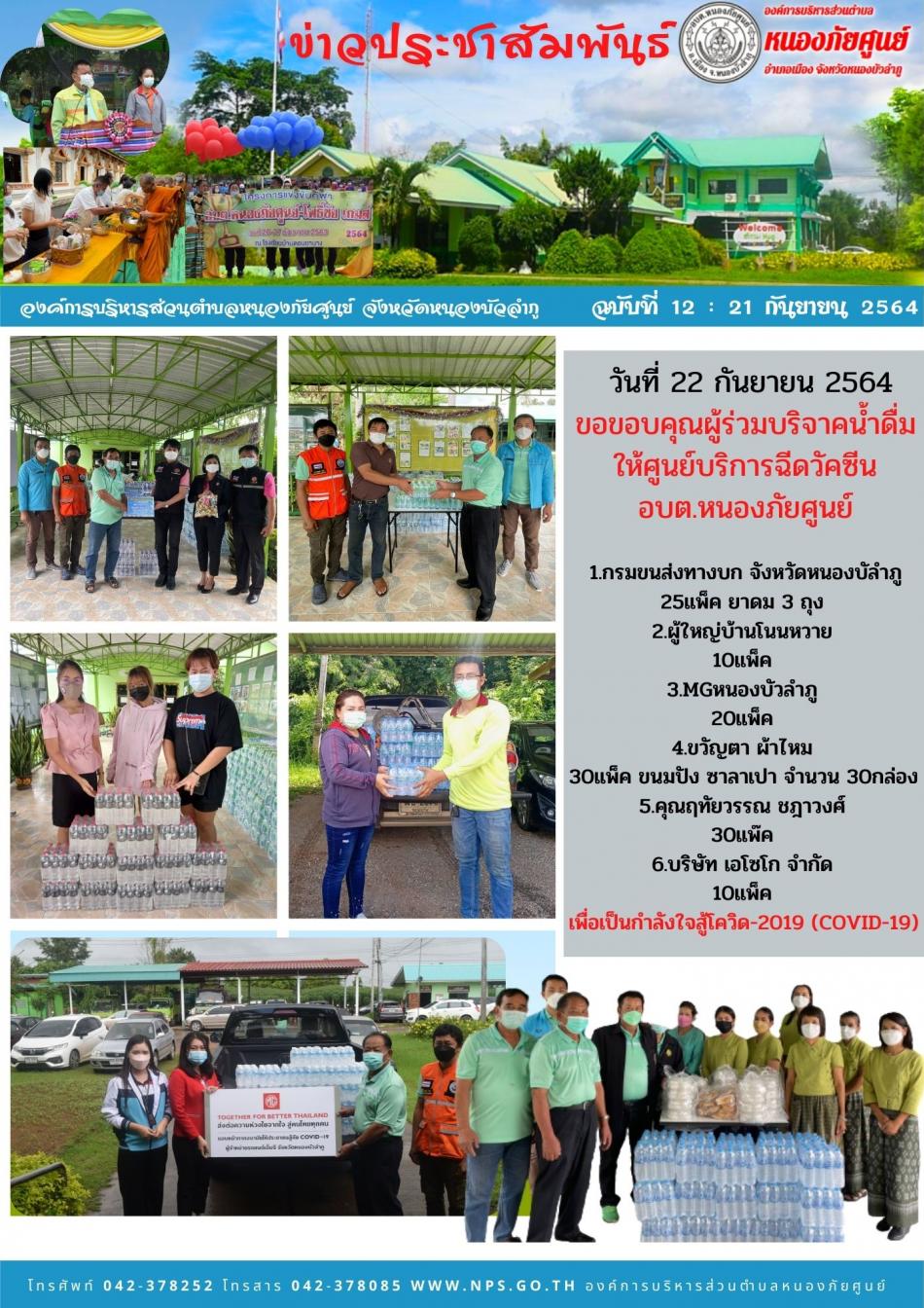 วันที่ 22 กันยายน 2564 ขอขอบคุณผู้ร่วมบริจาคน้ำดื่มให้ศูนย์บริการฉีดวัคซีน อบต.หนองภัยศูนย์ 1.กรมขนส่งทางบก จังหวัดหนองบัลำภู 25แพ็ค ยาดม 3 ถุง 2.ผู้ใหญ่บ้านโนนหวาย 10แพ็ค 3.MGหนองบัวลำภู 20แพ็ค 4.ขวัญตา ผ้าไหม 30แพ็ค ขนมปัง... [22 กันยายน 2564]