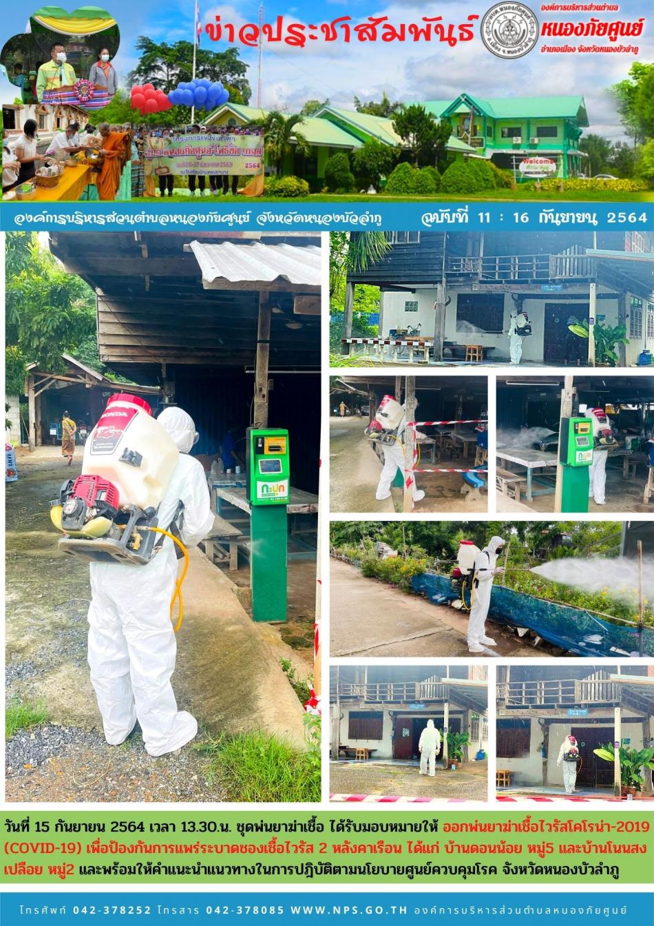 วันที่ 15 กันยายน 2564 เวลา 13.30.น. ชุดพ่นยาฆ่าเชื้อ ได้รับมอบหมายให้ ออกพ่นยาฆ่าเชื้อไวรัสโคโรน่า-2019 (COVID-19) เพื่อป้องกันการแพร่ระบาดชองเชื้อไวรัส 2 หลังคาเรือน ได้แก่ บ้านดอนน้อย หมู่5 และบ้านโนนสงเปลือย หมู่2... [16 กันยายน 2564]
