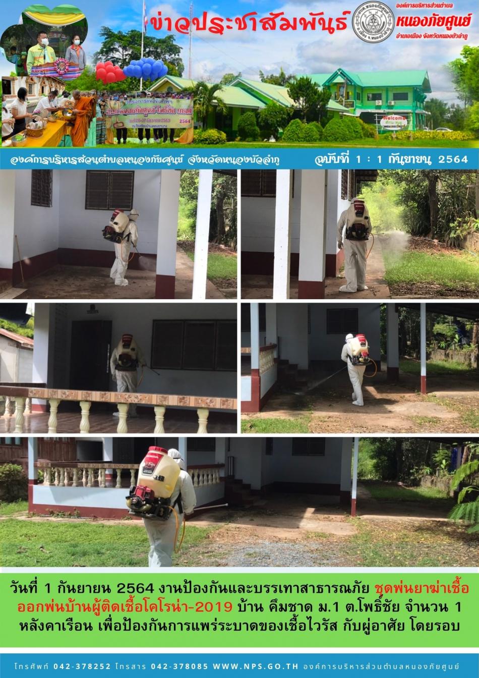วันที่ 1 กันยายน 2564 งานป้องกันและบรรเทาสาธารณภัย ชุดพ่นยาฆ่าเชื้อ ออกพ่นบ้านผู้ติดเชื้อโคโรน่า-2019 บ้าน คึมชาด ม.1 ต.โพธิ์ชัย จำนวน 1 หลังคาเรือน เพื่อป้องกันการแพร่ระบาดของเชื้อไวรัส กับผู่อาศัย โดยรอบ [1 กันยายน 2564]