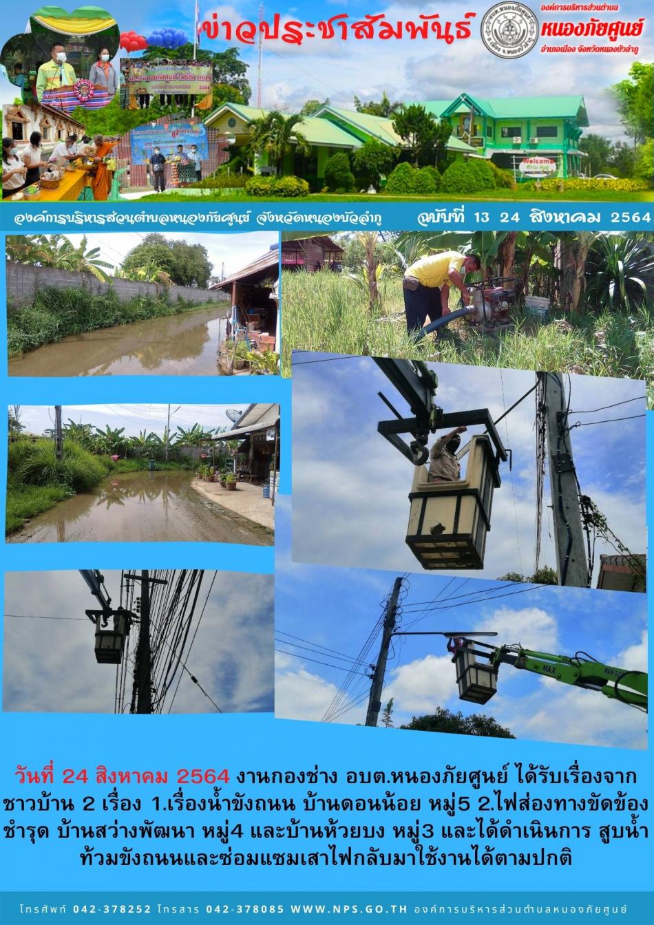 วันที่ 24 สิงหาคม 2564 งานกองช่าง อบต.หนองภัยศูนย์ ได้รับเรื่องจากชาวบ้าน 2 เรื่อง 1.เรื่องน้ำขังถนน บ้านดอนน้อย หมู่5 2.ไฟส่องทางขัดข้องชำรุด บ้านสว่างพัฒนา หมู่4 และบ้านห้วยบง หมู่3 และได้ดำเนินการ... [25 สิงหาคม 2564]