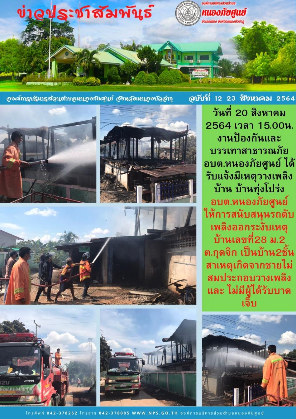 วันที่ 20 สิงหาคม 2564 เวลา 15.00น. งานป้องกันและบรรเทาสาธารณภัย อบต.หนองภัยศูนย์ ได้รับแจ้งมีเหตุวางเพลิงบ้าน บ้านทุ่งโปร่ง อบต.หนองภัยศูนย์ให้การสนับสนุนรถดับเพลิงออกระงับเหตุ บ้านเลขที่28 ม.2 ต.กุดจิก เป็นบ้าน2ชั้น... [23 สิงหาคม 2564]