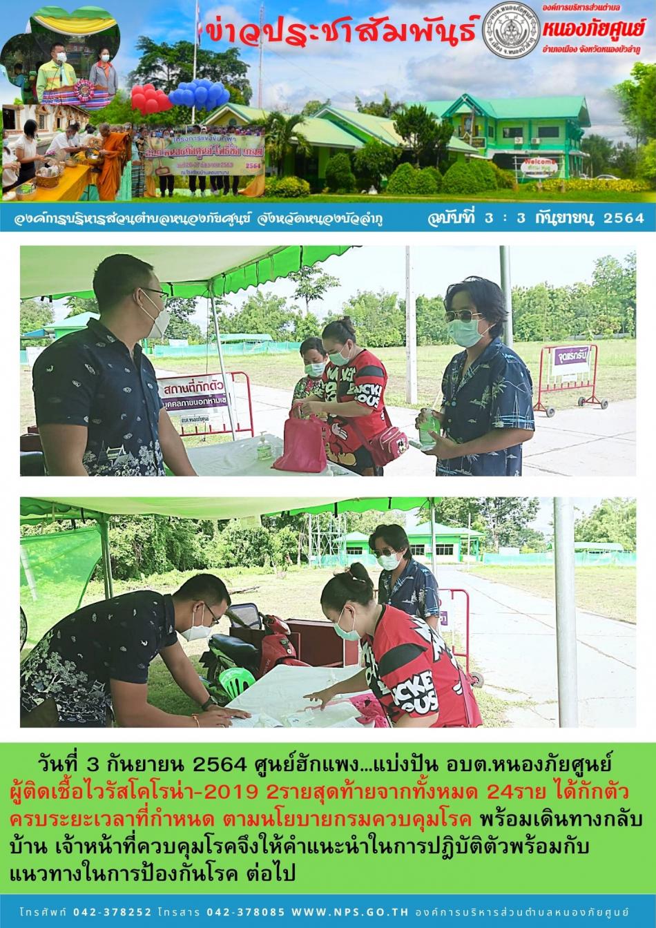 วันที่ 3 กันยายน 2564 ศูนย์ฮักแพง...แบ่งปัน อบต.หนองภัยศูนย์ ผู้ติดเชื้อไวรัสโคโรน่า-2019 2รายสุดท้ายจากทั้งหมด 24ราย ได้กักตัวครบระยะเวลาที่กำหนด ตามนโยบายกรมควบคุมโรค พร้อมเดินทางกลับบ้าน... [3 กันยายน 2564]