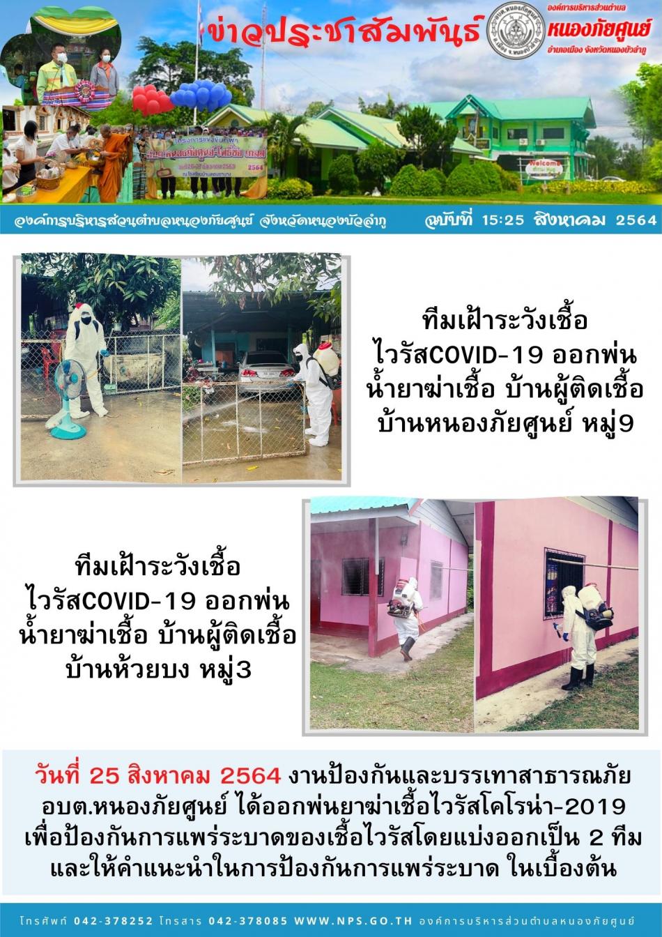 วันที่ 25 สิงหาคม 2564 งานป้องกันและบรรเทาสาธารณภัย อบต.หนองภัยศูนย์ ได้ออกพ่นยาฆ่าเชื้อไวรัสโคโรน่า-2019 เพื่อป้องกันการแพร่ระบาดของเชื้อไวรัสโดยแบ่งออกเป็น 2 ทีม และให้คำแนะนำในการป้องกันการแพร่ระบาด ในเบื้องต้น [25 สิงหาคม 2564]