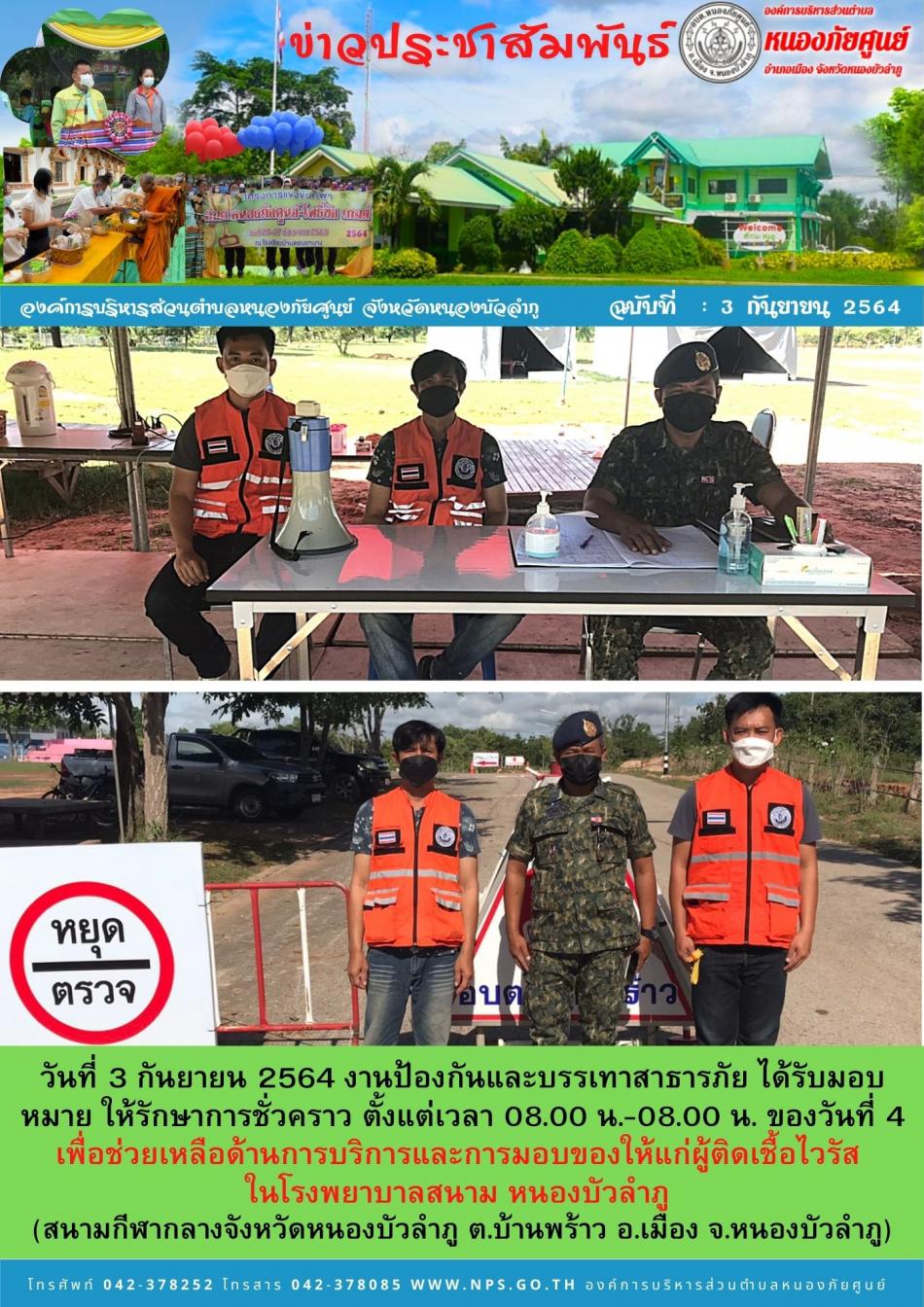 วันที่ 3 กันยายน 2564 งานป้องกันและบรรเทาสาธารภัย ได้รับมอบหมาย ให้รักษาการชั่วคราว ตั้งแต่เวลา 08.00 น.-08.00 น. ของวันที่ 4 เพื่อช่วยเหลือด้านการบริการและการมอบของให้แก่ผู้ติดเชื้อไวรัส ในโรงพยาบาลสนาม หนองบัวลำภู ... [3 กันยายน 2564]