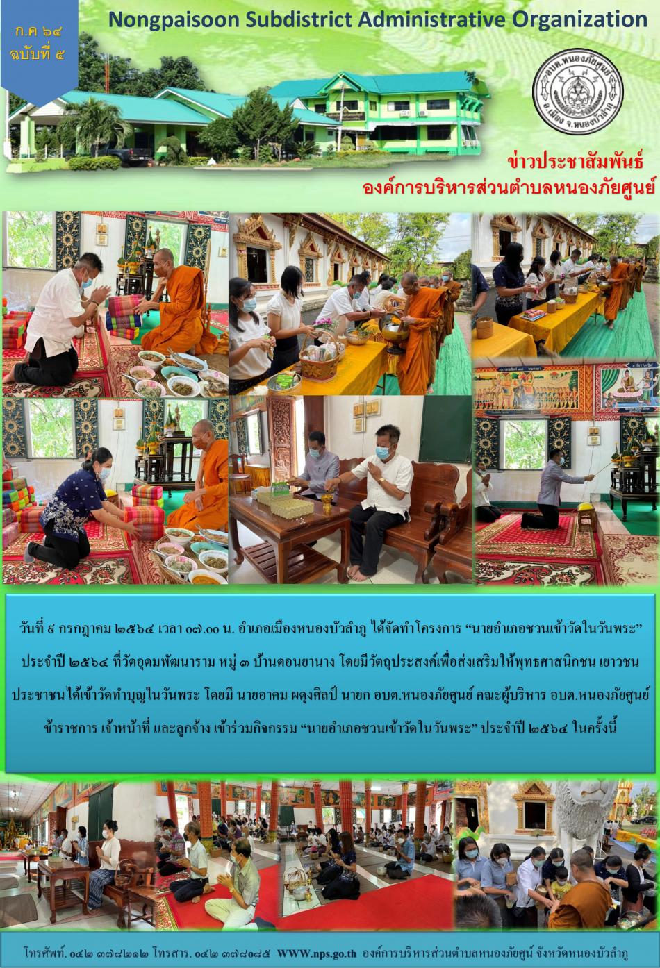 วันที่ ๙ กรกฎาคม ๒๕๖๔ เวลา o๗.oo น. อำเภอเมืองหนองบัวลำภู ได้จัดทำโครงการ “นายอำเภอชวนเข้าวัดในวันพระ” ประจำปี ๒๕๖๔ ที่วัดอุดมพัฒนาราม หมู่ ๓ บ้านดอนยานาง โดยมีวัตถุประสงค์เพื่อส่งเสริมให้พุทธศาสนิกชน เยาวชน... [9 กรกฎาคม 2564]