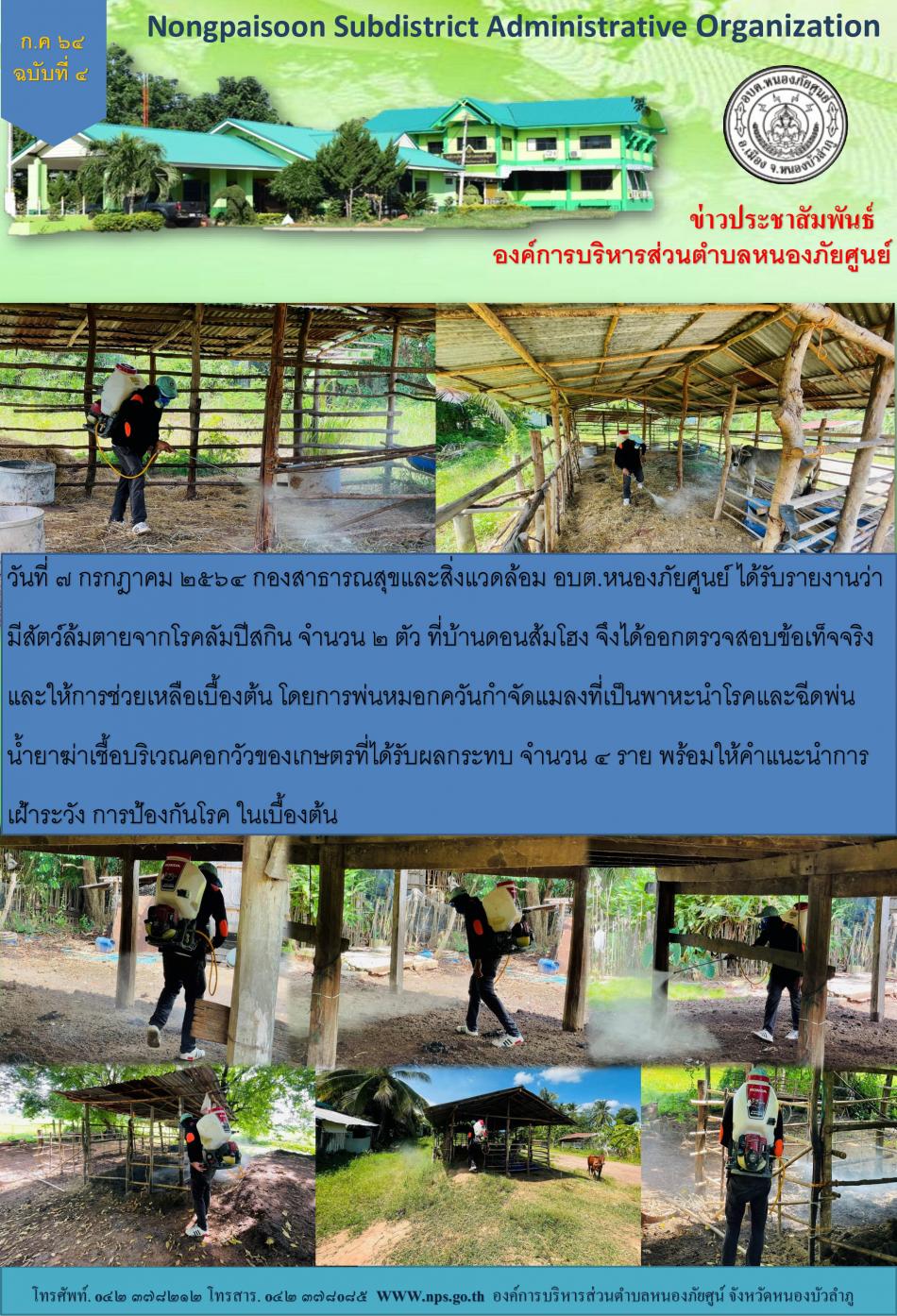 วันที่ ๗ กรกฎาคม ๒๕๖๔ กองสาธารณสุขและสิ่งแวดล้อม อบต.หนองภัยศูนย์ ได้รับรายงานว่ามีสัตว์ล้มตายจากโรคลัมปีสกิน จำนวน ๒ ตัว ที่บ้านดอนส้มโฮง จึงได้ออกตรวจสอบข้อเท็จจริง และให้การช่วยเหลือเบื้องต้น... [8 กรกฎาคม 2564]
