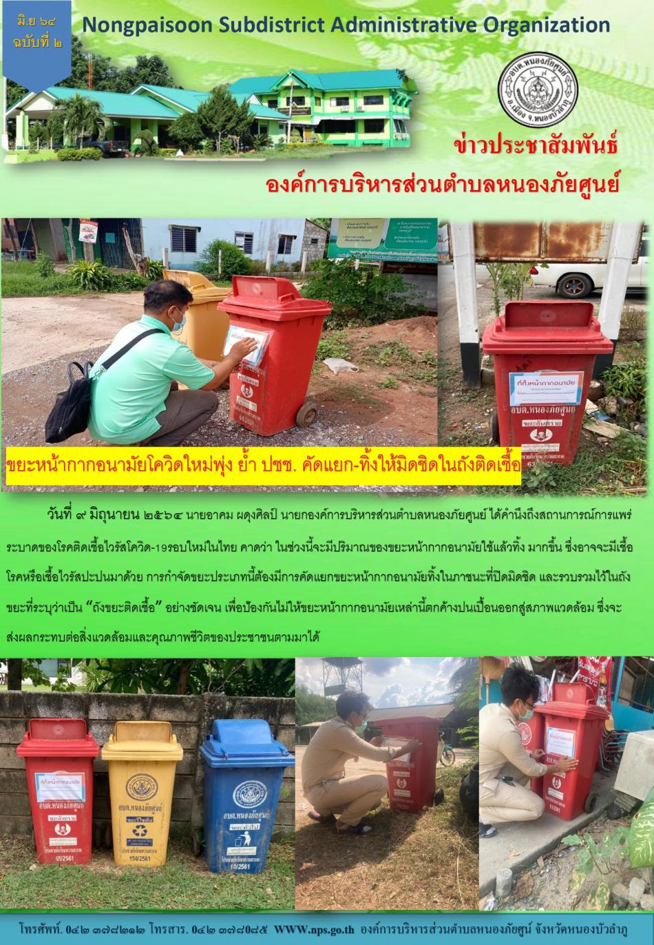 วันที่ ๙ มิถุนายน ๒๕๖๔ นายอาคม ผดุงศิลป์ นายกองค์การบริหารส่วนตำบลหนองภัยศูนย์ ได้คำนึงถึงสถานการณ์การแพร่ระบาดของโรคติดเชื้อไวรัสโควิด-19รอบใหม่ในไทย คาดว่า ในช่วงนี้จะมีปริมาณของขยะหน้ากากอนามัยใช้แล้วทิ้ง... [10 มิถุนายน 2564]