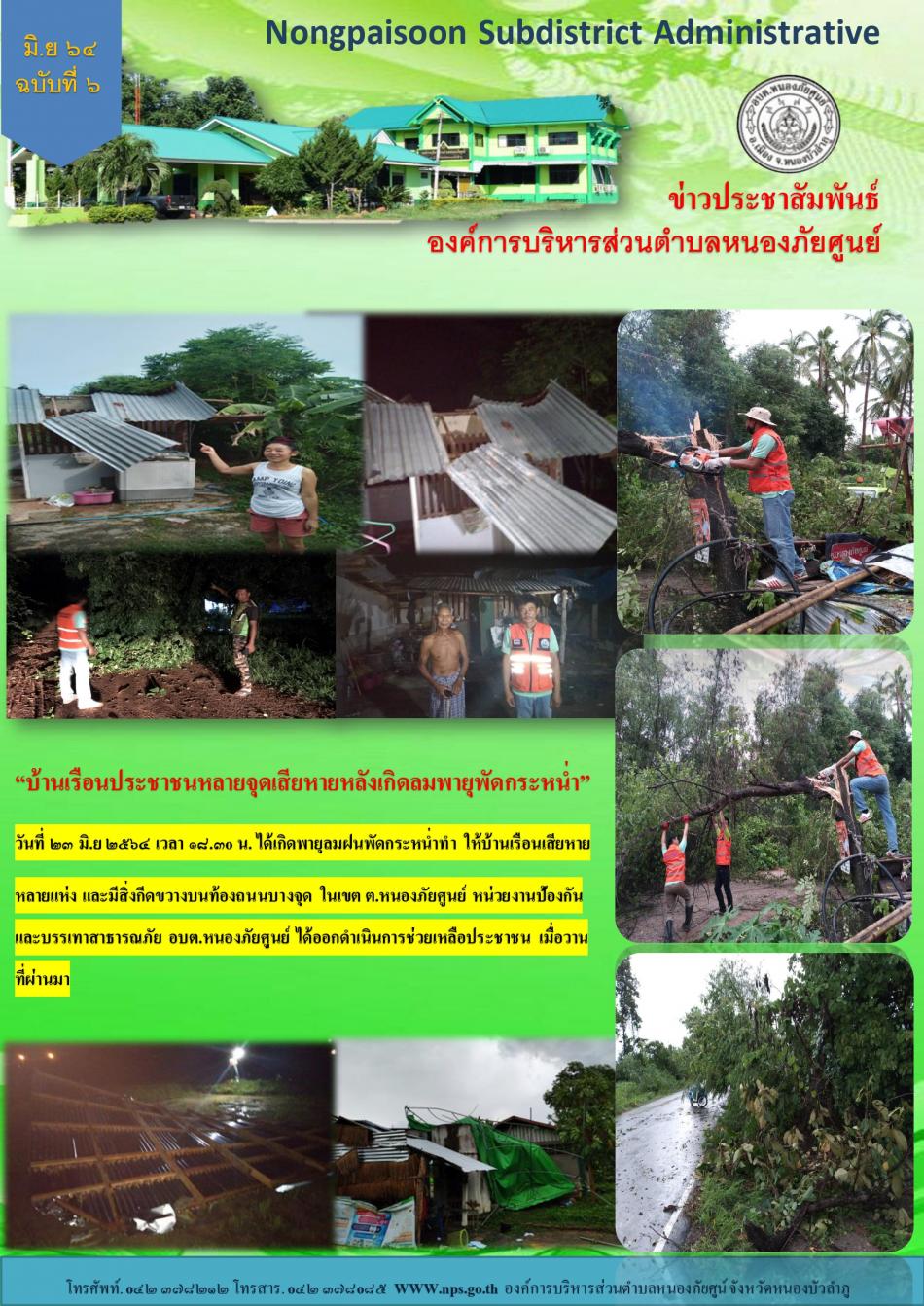 วันที่ ๒๓ มิ.ย ๒๕๖๔ เวลา ๑๘.๓o น. ได้เกิดพายุลมฝนพัดกระหน่ำทำ ให้บ้านเรือนเสียหาย หลายแห่ง และมีสิ่งกีดขวางบนท้องถนนบางจุด ในเขต ต.หนองภัยศูนย์ หน่วยงานป้องกันและบรรเทาสาธารณภัย อบต.หนองภัยศูนย์... [24 มิถุนายน 2564]