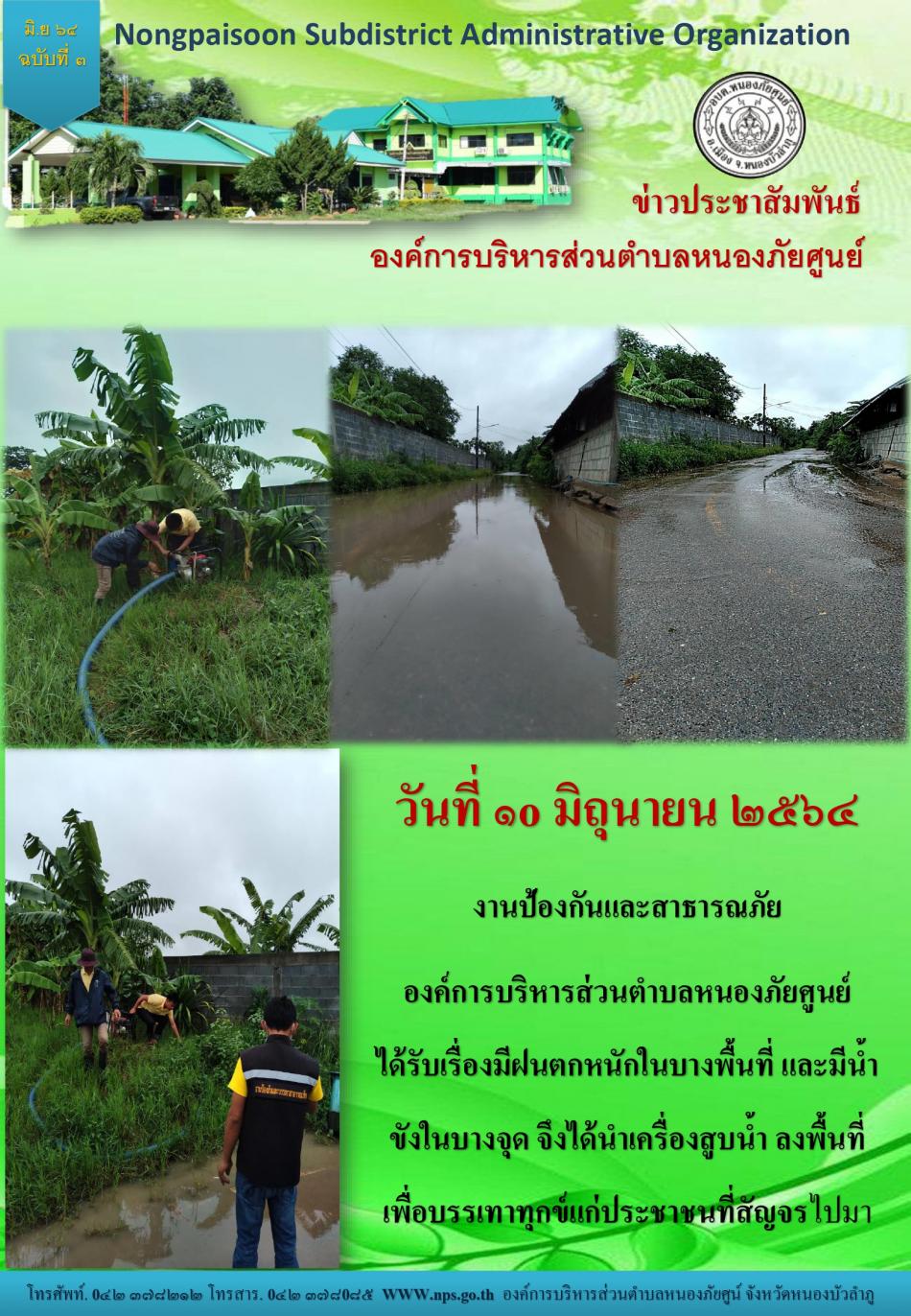 วันที่ ๑o มิถุนายน ๒๕๖๔ งานป้องกันและสาธารณภัย องค์การบริหารส่วนตำบลหนองภัยศูนย์ ได้รับเรื่องมีฝนตกหนักในบางพื้นที่ และมีน้ำขังในบางจุด จึงได้นำเครื่องสูบน้ำ ลงพื้นที่ เพื่อบรรเทาทุกข์แก่ประชาชนที่สัญจรไปมา [11 มิถุนายน 2564]