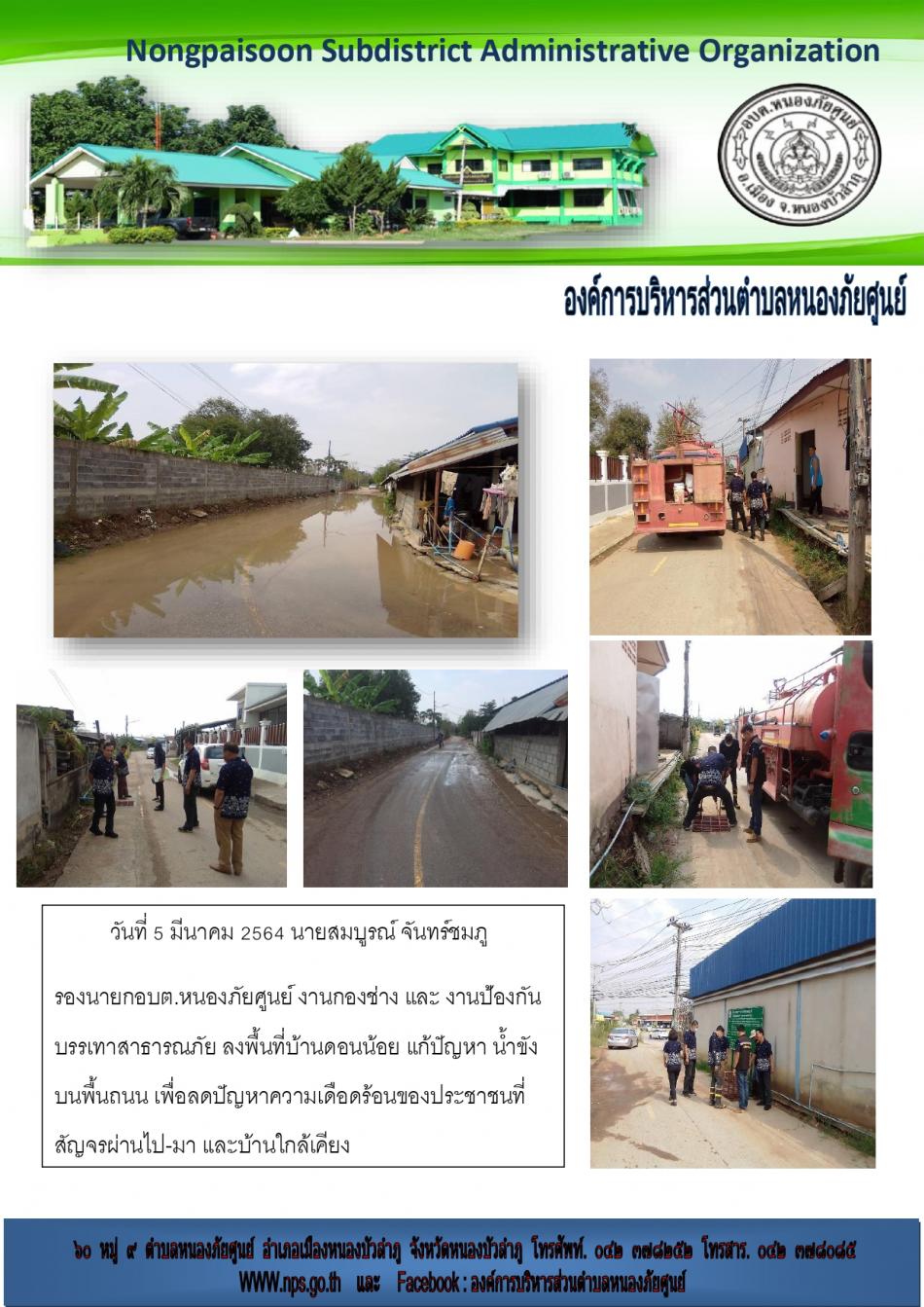 วันที่ 5 มีนาคม 2564 นายสมบูรณ์ จันทร์ชมภู รองนายกอบต.หนองภัยศูนย์ งานกองช่าง และ งานป้องกันบรรเทาสาธารณภัย ลงพื้นที่บ้านดอนน้อย แก้ปัญหา น้ำขังบนพื้นถนน เพื่อลดปัญหาความเดือดร้อนของประชาชนที่สัญจรผ่านไป-มา... [8 มีนาคม 2564]
