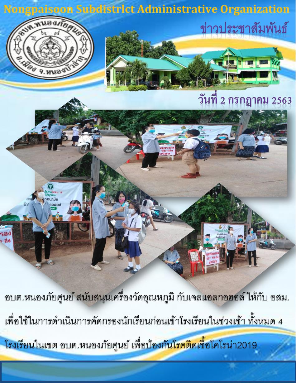 อบต.หนองภัยศูนย์ สนับสนุนเครื่องวัดอุณหภูมิ กับเจลแอลกอฮอล์ ให้กับ อสม. เพื่อใช้ในการดำเนินการคัดกรองนักเรียนก่อนเข้าโรงเรียนในช่วงเช้า ทั้งหมด 4 โรงเรียนในเขต อบต.หนองภัยศูนย์ เพื่อป้องกันโรคติดเชื้อโคโรน่า2019