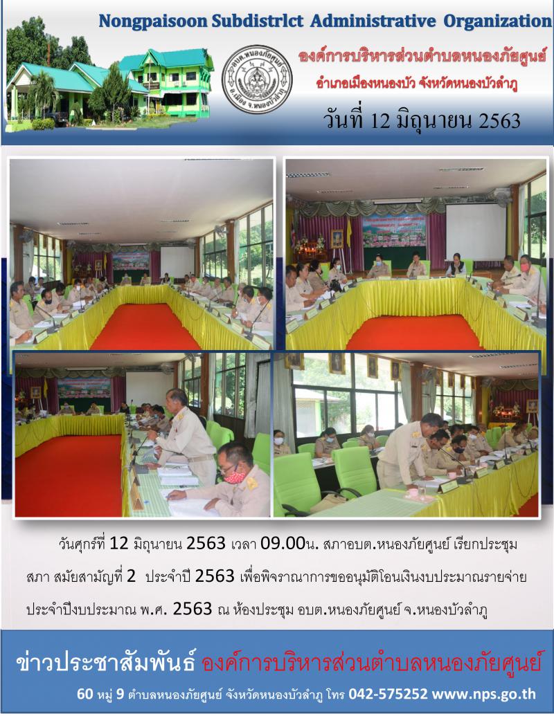 วันศุกร์ที่ 12 มิถุนายน 2563 เวลา 09.00น. สภาอบต.หนองภัยศูนย์ เรียกประชุมสภา สมัยสามัญที่ 2 ประจำปี 2563 เพื่อพิจราณาการขออนุมัติโอนเงินงบประมาณรายจ่าย ประจำปีงบประมาณ พ.ศ. 2563 ณ ห้องประชุม อบต.หนองภัยศูนย์ จ.หนองบัวลำภู