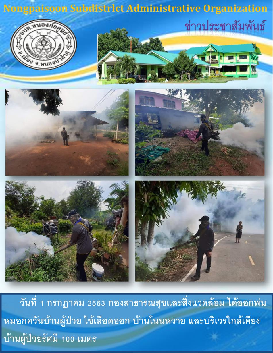 วันที่ 1 กรกฎาคม 2563 กองสาธารณสุขและสิ่งแวดล้อม ได้ออกพ่นหมอกควันบ้านผู้ป่วย ไข้เลือดออก บ้านโนนหวาย และบริเวรใกล้เคียงบ้านผู้ป่วยรัศมี 100 เมตร