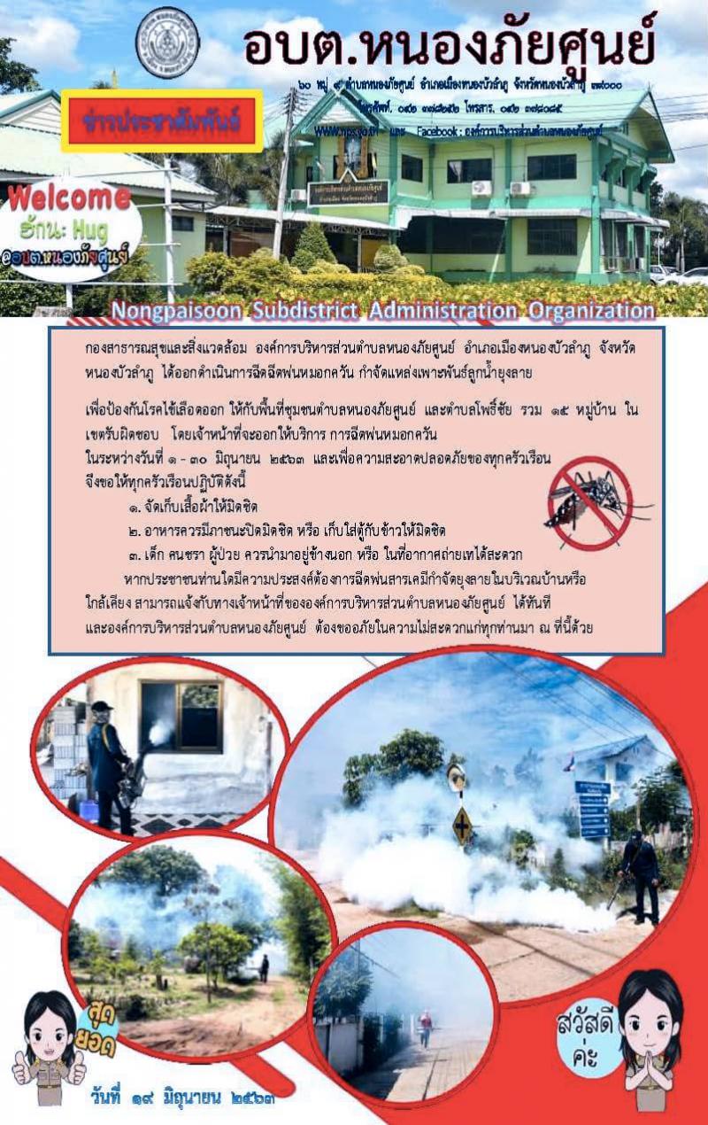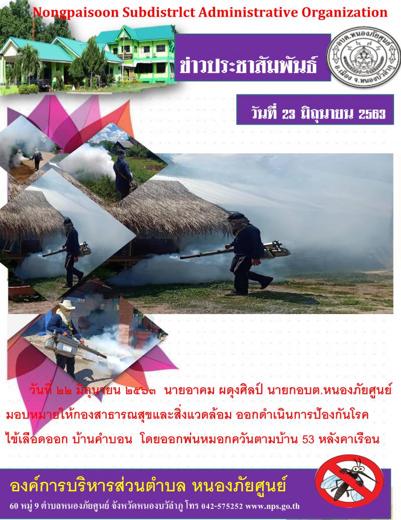 วันที่ ๒๒ มิถุนายน ๒๕๖๓ นายอาคม ผดุงศิลป์ นายกอบต.หนองภัยศูนย์ มอบหมายให้กองสาธารณสุขและสิ่งแวดล้อม ออกดำเนินการป้องกันโรคไข้เลือดออก บ้านคำบอน โดยออกพ่นหมอกควันตามบ้าน 53 หลังคาเรือน