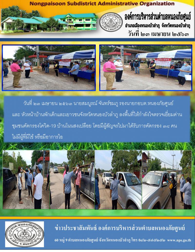 วันที่ ๒๓ เมษายน ๒๕๖๓ นายสมบูรณ์ จันทร์ชมภู รองนายกอบต.หนองภัยศูนย์ และ หัวหน้าบ้านพักเด็กและเยาวชนจังหวัดหนองบัวลำภู ลงพื้นที่ให้กำลังใจตรวจเยี่ยมด่านชุมชนคัดกรองโควิด-19 บ้านโนนสงเปลือย...