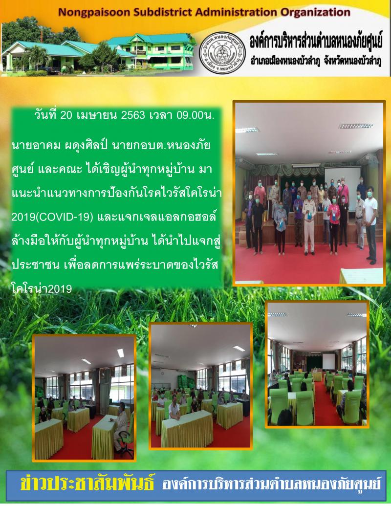 วันที่ ๒o เมษายน ๒๕๖๓ เวลา o๙.oo น. นายอาคม ผดุงศิลป์ นายกอบต.หนองภัยศูนย์และคณะ ได้เชิญผู้นำทุกหมู่บ้านมาแนะนำแนวทางการป้องกันโรคไวรัสโคโรน่า2019(COVID-19) และแจกเจลแอลกอฮอล์ล้างมือให้กับผู้นำทุกหมู่บ้าน...