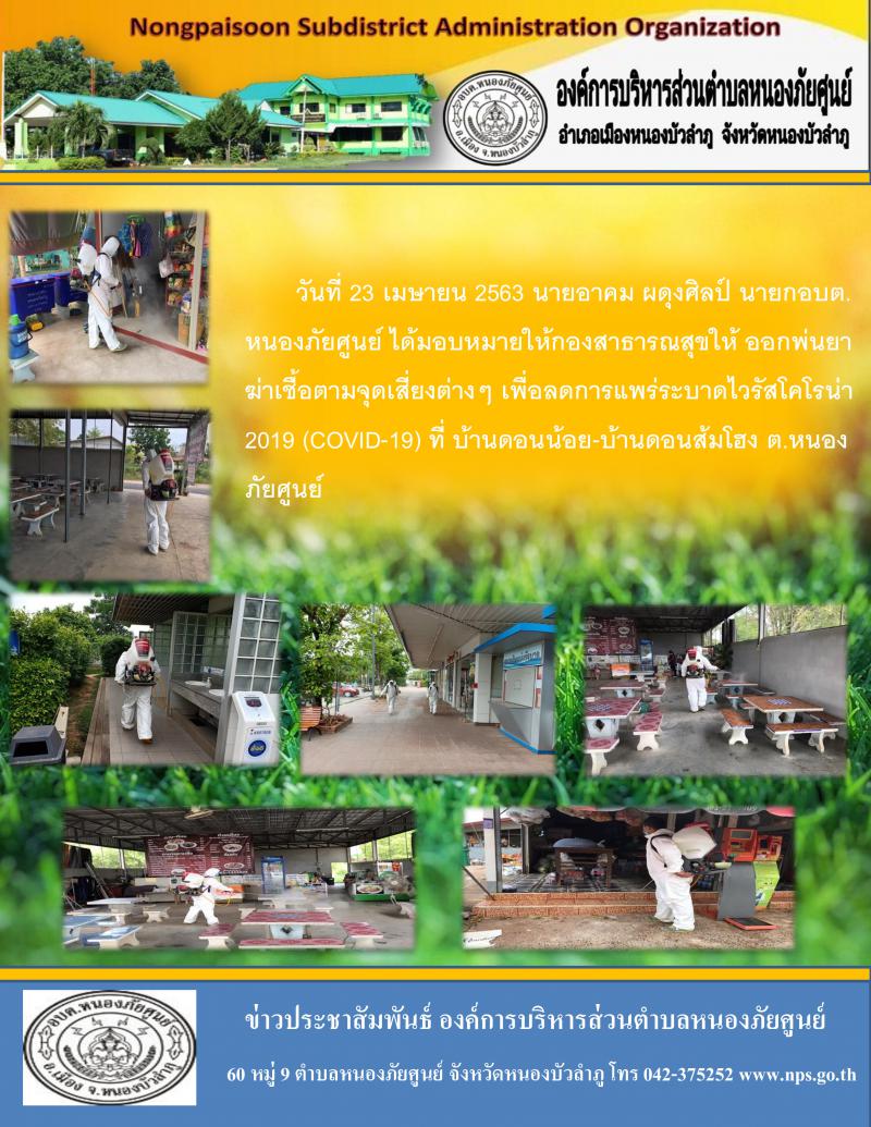 วันที่ 23 เมษายน 2563 นายอาคม ผดุงศิลป์ นายกอบต.หนองภัยศูนย์ ได้มอบหมายให้กองสาธารณสุขให้ ออกพ่นยาฆ่าเชื้อตามจุดเสี่ยงต่างๆ เพื่อลดการแพร่ระบาดไวรัสโคโรน่า2019 (COVID-19) ที่ บ้านดอนน้อย-บ้านดอนส้มโฮง ต.หนองภัยศูนย์