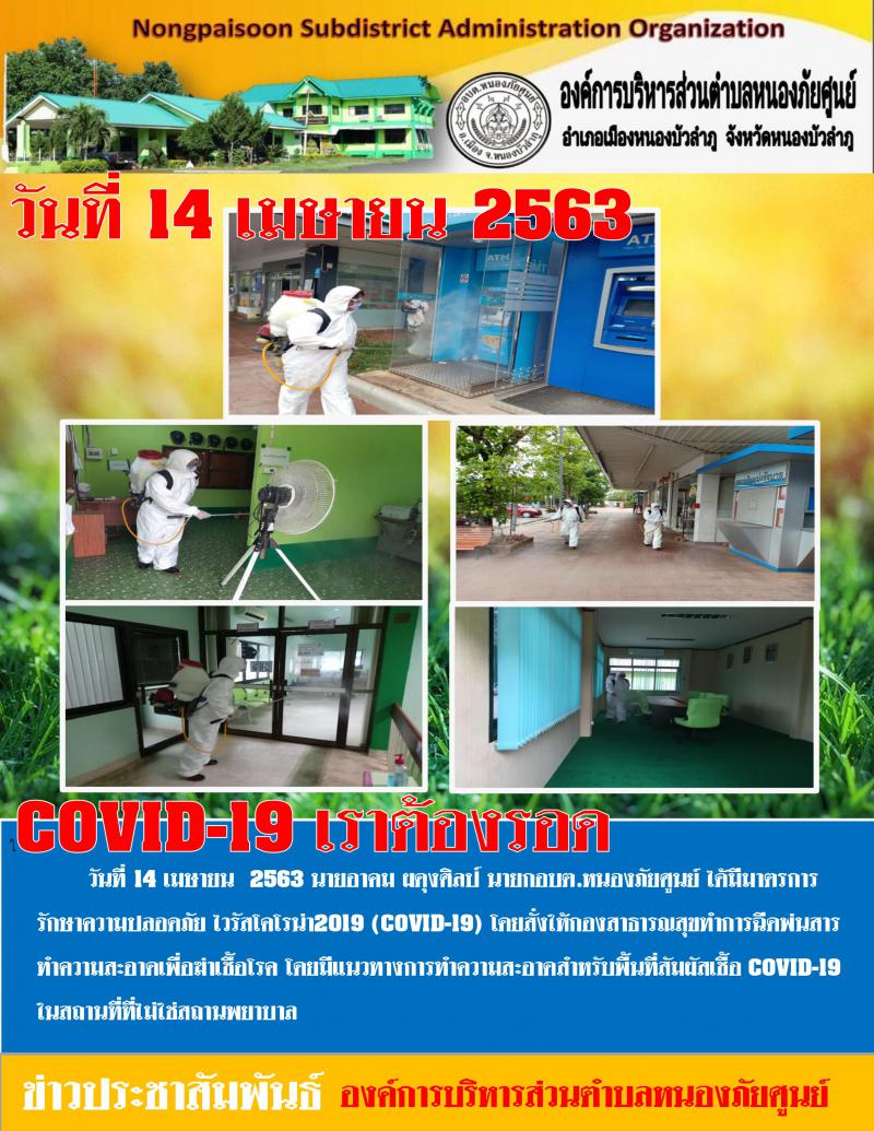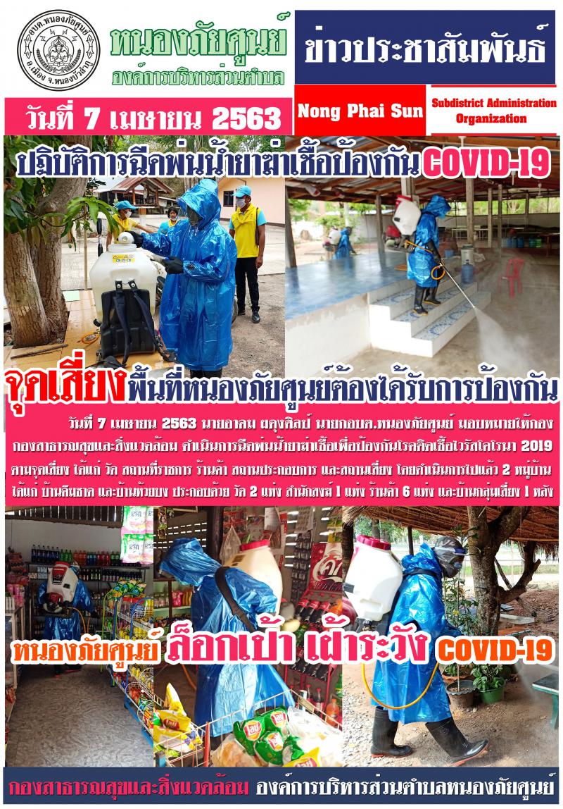 วันที่ 7 เมษายน 2563 นายอาคม ผดุงศิลป์ นายกอบต.หนองภัยศูนย์ มอบหมายให้กองสาธารณสุขและสิ่งแวดล้อม ดำเนินการฉีดพ่นน้ำยาฆ่าเชื้อเพื่อป้องกันโรคติดต่อไวรัสโคโรน่า 2019 (COVID-19)