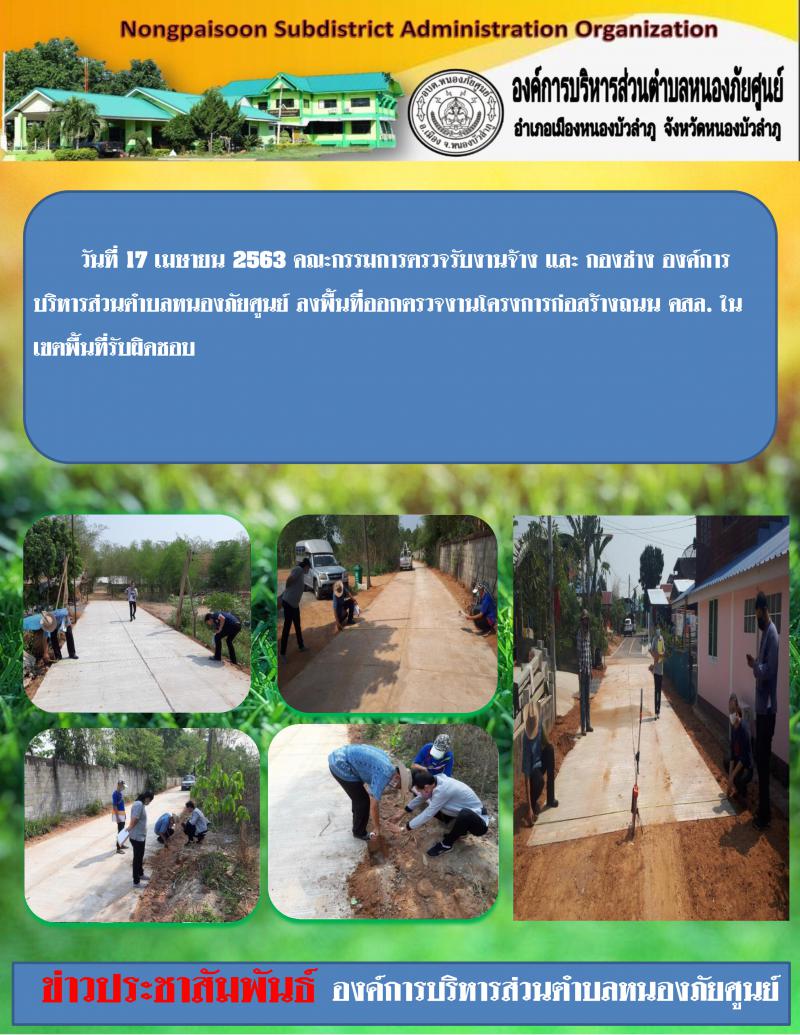 วันที่ 17 เมษายน 2563 คณะกรรมการตรวจรับงานจ้าง และ กองช่าง องค์การบริหารส่วนตำบลหนองภัยศูนย์ ลงพื้นที่ออกตรวจงานโครงการก่อสร้างถนน คสล. ในเขตพื้นที่รับผิดชอบ