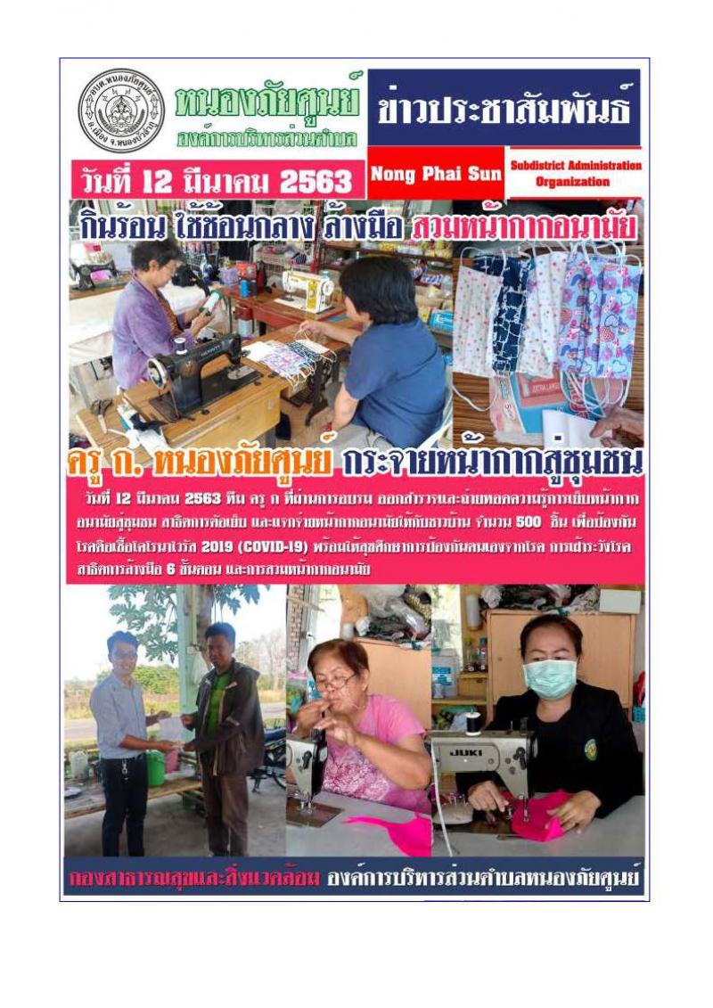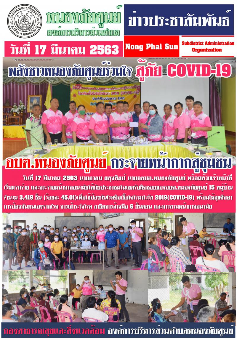 เมื่อวันที่ ๑๗ มีนาคม ๒๕๖๓ นายอาคม ผดุงศิลป์ นายกอบต.หนองภัยศูนย์ พร้อมด้วยเจ้าหน้าที่เริ่มแจกจ่าย และกระจายหน้ากากอนามัยให้กับประชาชนในเขตรับผิดชอบของ อบต.หนองภัยศูนย์ ๑๕ หมู่บ้าน จำนวน ๓,๔๑๙ ชิ้น...