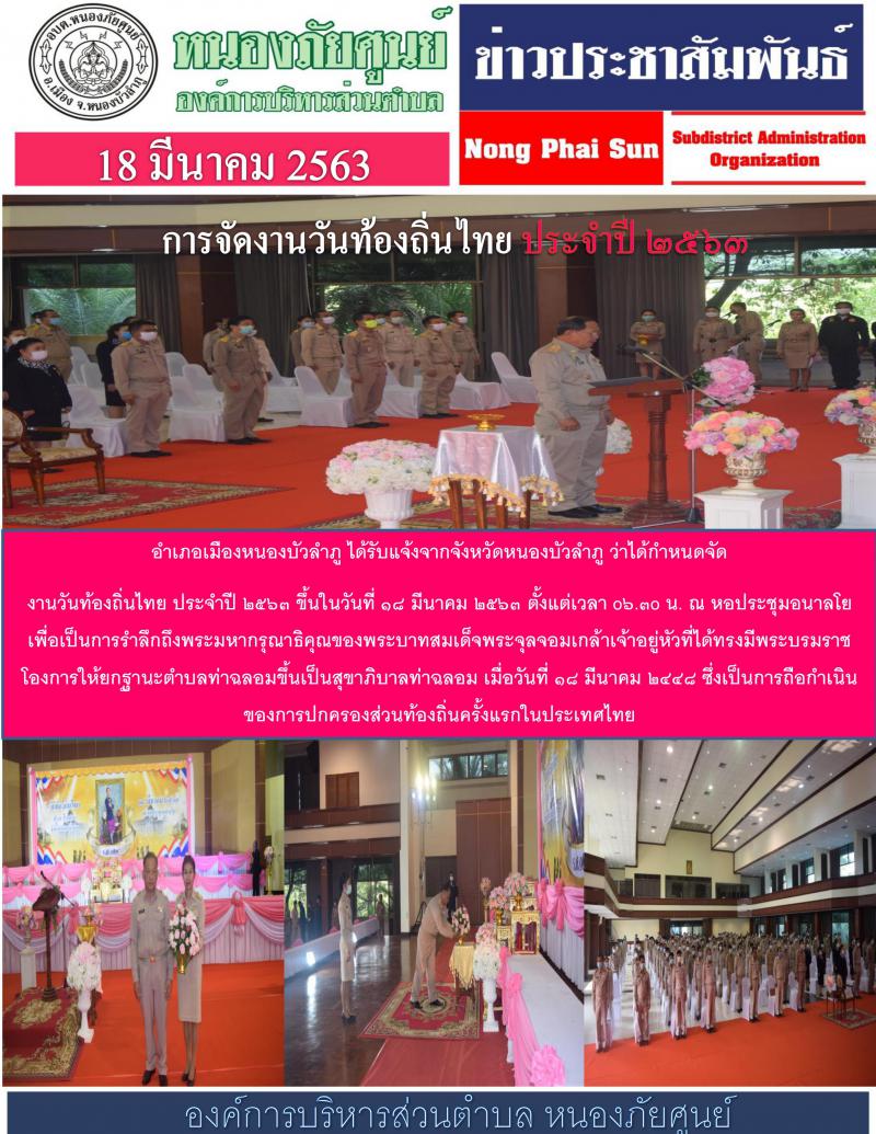 อำเภอเมืองหนองบัวลำภู ได้รับแจ้งจากจังหวัดหนองบัวลำภู ว่าได้กำหนดจัดงานวันท้องถิ่นไทย ประจำปี ๒๕๖๓ ขึ้นในวันที่ ๑๘ มีนาคม ๒๕๖๓ ตั้งแต่เวลา o๖.๓o น. ณ หอประชุมอนาลโย เพื่อเป็นการรำลึกถึงพระมหากรุณาธิคุณ...