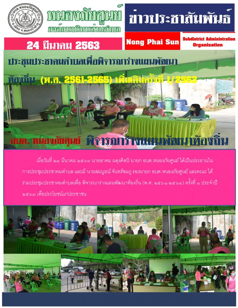 เมื่อวันที่ ๒๔ มีนาคม ๒๕๖๓ นายอาคม ผดุงศิลป์ นายก อบต.หนองภัยศูนย์ ได้เป็นประธานในการประชุมประชาคมตำบล และมี นายสมบูรณ์ จันทร์ชมภู รองนายก อบต.หนองภัยศูนย์ และคณะ ได้ร่วมประชุมประชาคมตำบลเพื่อ...