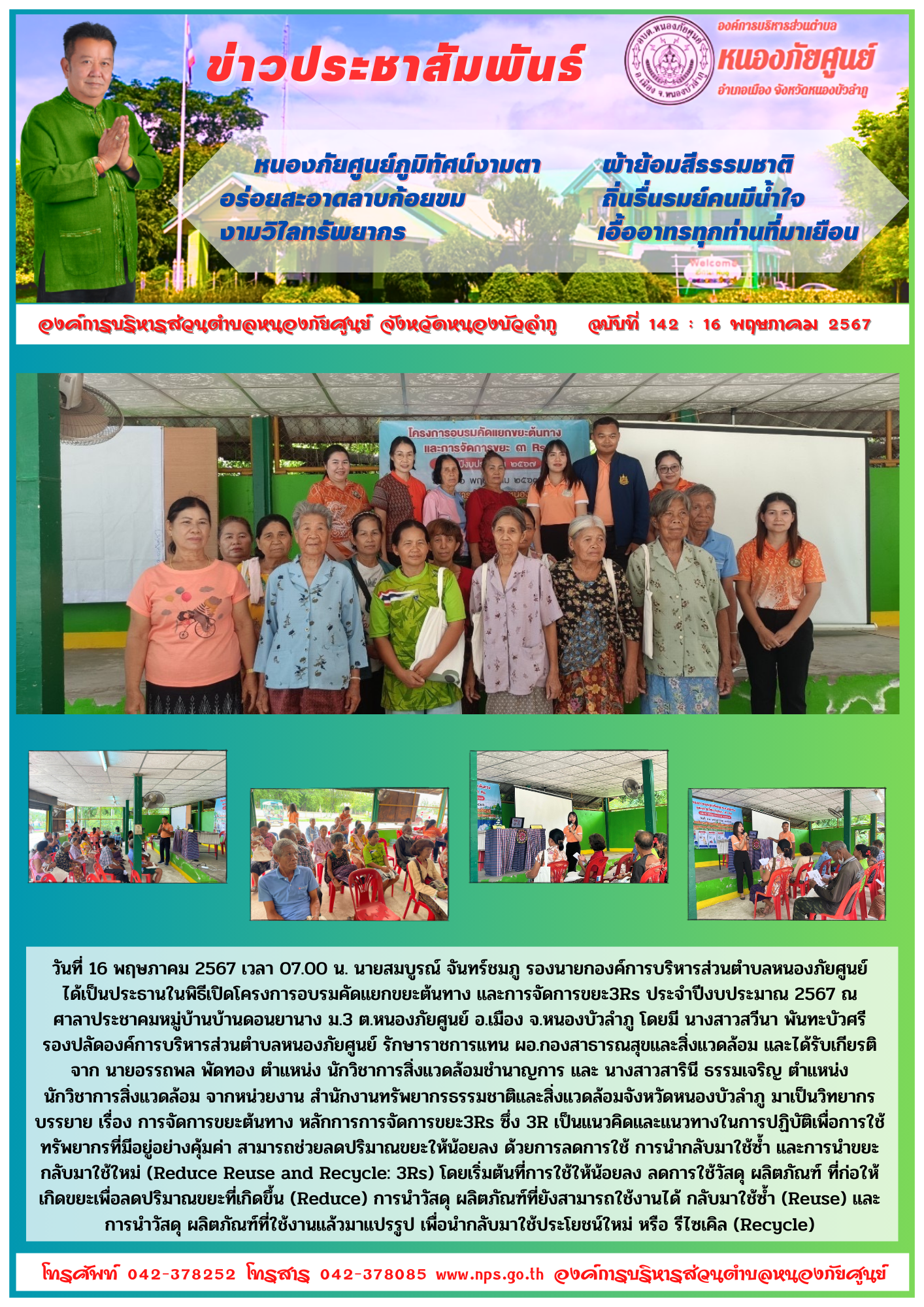วันที่ 16 พฤษภาคม 2567 เวลา 07.00 น. นายสมบูรณ์ จันทร์ชมภู รองนายกองค์การบริหารส่วนตำบลหนองภัยศูนย์ ได้เป็นประธานในพิธีเปิดโครงการอบรมคัดแยกขยะต้นทาง และการจัดการขยะ3Rs ประจำปีงบประมาณ 2567 ณ ... [16 พฤษภาคม 2567]