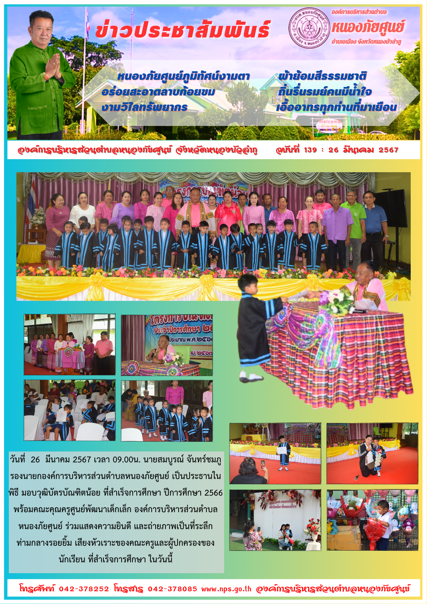 วันที่ 26 มีนาคม 2567 เวลา 09.00น. นายสมบูรณ์ จันทร์ชมภู รองนายกองค์การบริหารส่วนตำบลหนองภัยศูนย์ เป็นประธานในพิธี มอบวุฒิบัตรบัณฑิตน้อย ที่สำเร็จการศึกษา ปีการศึกษา 2566 พร้อมคณะคุณครูศูนย์พัฒนาเด็กเล็ก... [26 มีนาคม 2567]