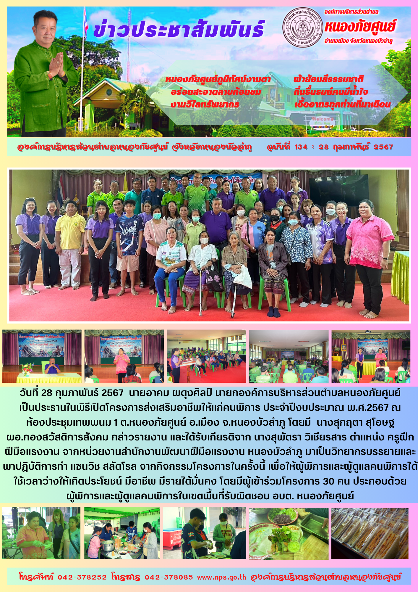 วันที่ 28 กุมภาพันธ์ 2567 นายอาคม ผดุงศิลป์ นายกองค์การบริหารส่วนตำบลหนองภัยศูนย์ เป็นประธานในพิธีเปิดโครงการส่งเสริมอาชีพให้แก่คนพิการ ประจำปีงบประมาณ พ.ศ.2567 ณ ห้องประชุมเทพพนม 1 ต.หนองภัยศูนย์ อ.เมือง จ.หนองบัวลำภู... [29 กุมภาพันธ์ 2567]