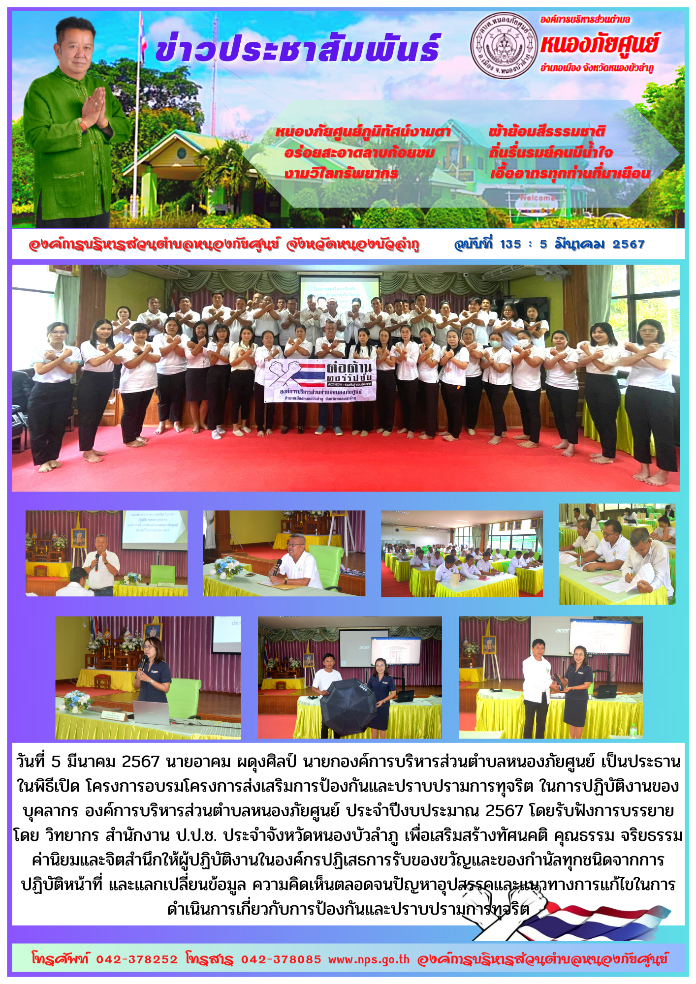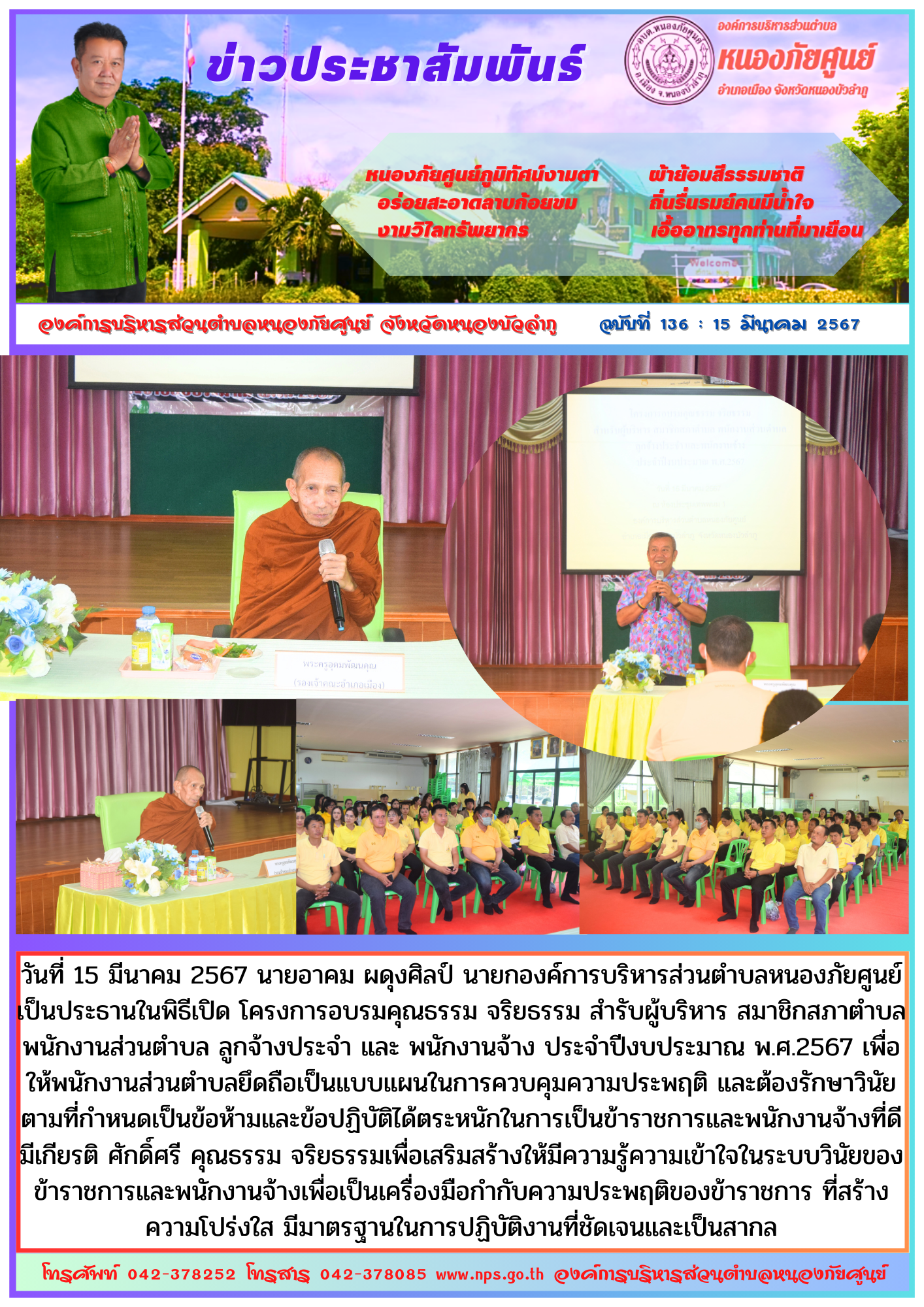 วันที่ 5 มีนาคม 2567 นายอาคม ผดุงศิลป์ นายกองค์การบริหารส่วนตำบลหนองภัยศูนย์ เป็นประธานในพิธีเปิด โครงการอบรมโครงการส่งเสริมการป้องกันและปราบปรามการทุจริต ในการปฏิบัติงานของบุคลากร... [6 มีนาคม 2567]