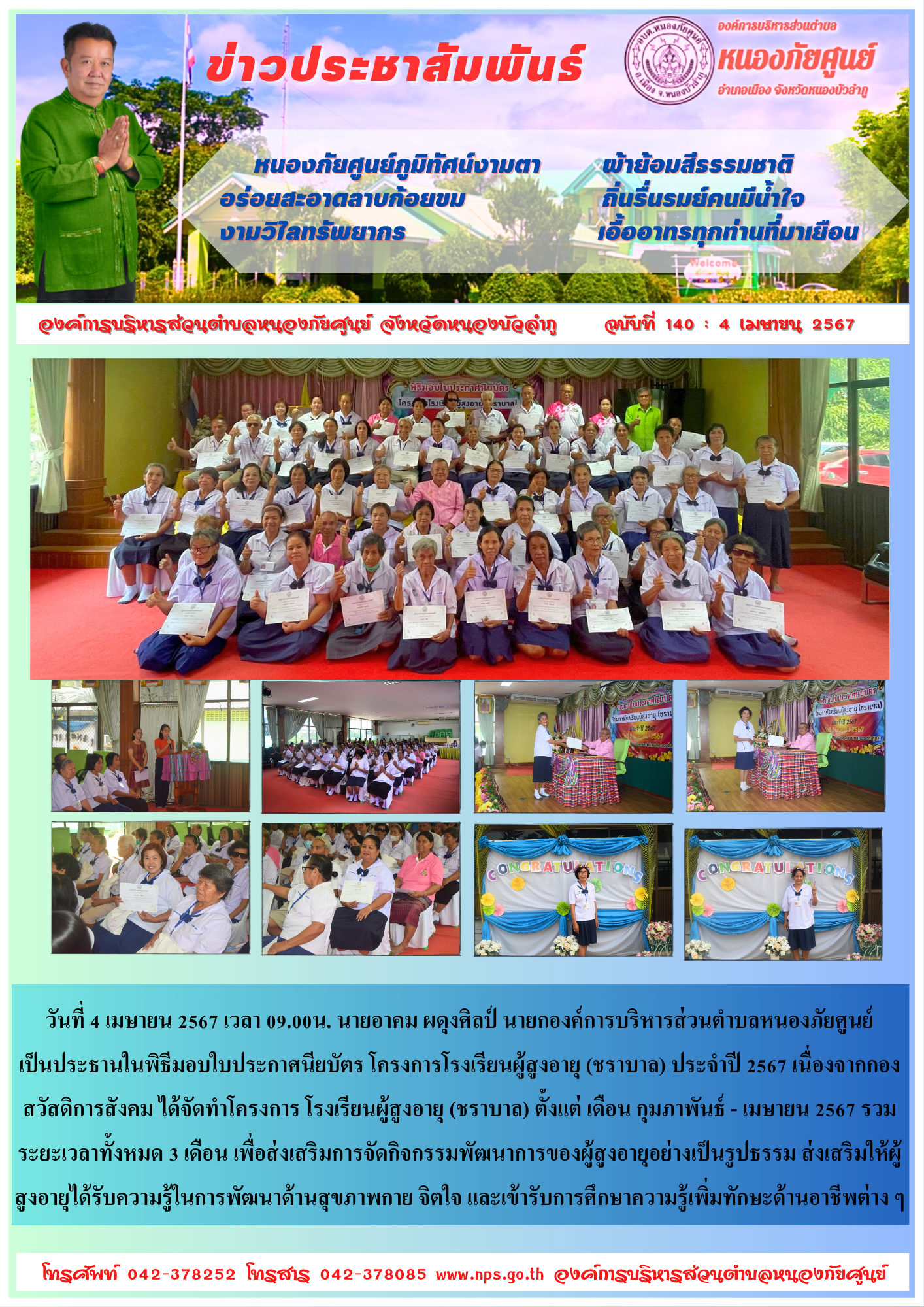 วันที่ 4 เมษายน 2567 เวลา 09.00น. นายอาคม ผดุงศิลป์ นายกองค์การบริหารส่วนตำบลหนองภัยศูนย์ เป็นประธานในพิธีมอบใบประกาศนียบัตร โครงการโรงเรียนผู้สูงอายุ (ชราบาล) ประจำปี 2567 เนื่องจากกองสวัสดิการสังคม ได้จัดทำโครงการ... [4 เมษายน 2567]