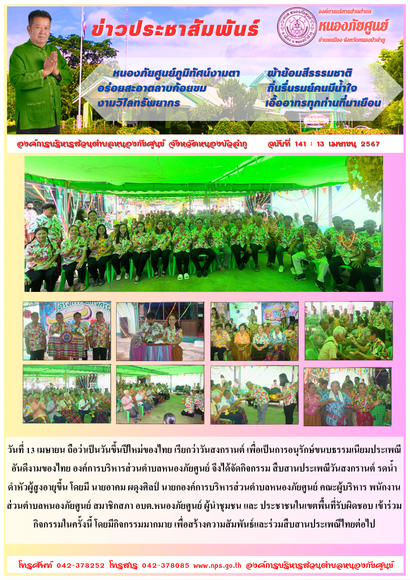 วันที่ 13 เมษายน ถือว่าเป็นวันขึ้นปีใหม่ของไทย เรียกว่าวันสงกรานต์ เพื่อเป็นการอนุรักษ์ขนบธรรมเนียมประเพณีอันดีงามของไทย องค์การบริหารส่วนตำบลหนองภัยศูนย์ จึงได้จัดกิจกรรม สืบสานประเพณีวันสงกรานต์... [19 เมษายน 2567]