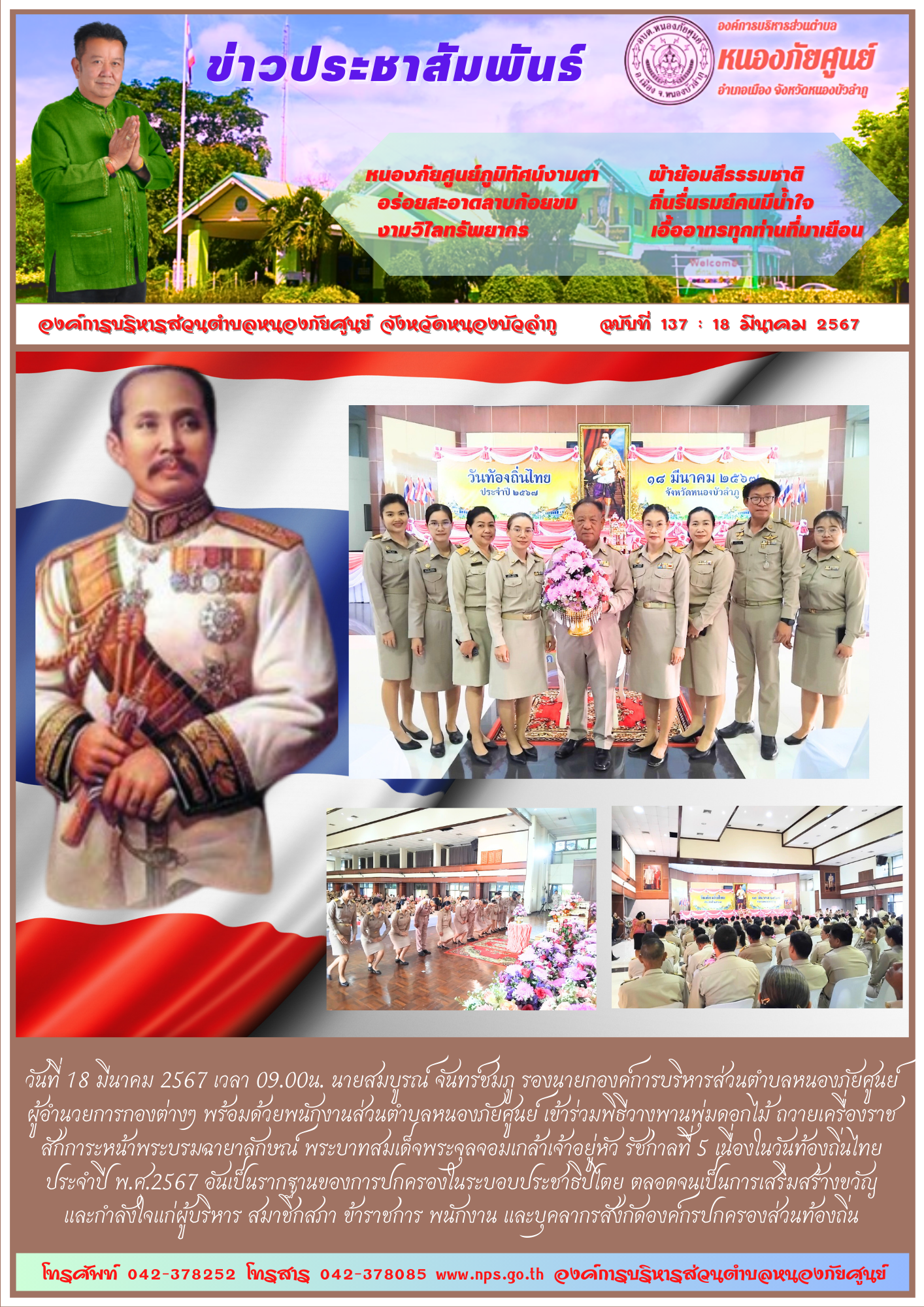 วันที่ 18 มีนาคม 2567 เวลา 09.00น. นายสมบูรณ์ จันทร์ชมภู รองนายกองค์การบริหารส่วนตำบลหนองภัยศูนย์ ผู้อำนวยการกองต่างๆ พร้อมด้วยพนักงานส่วนตำบลหนองภัยศูนย์ เข้าร่วมพิธีวางพานพุ่มดอกไม้ ถวายเครื่องราช... [18 มีนาคม 2567]