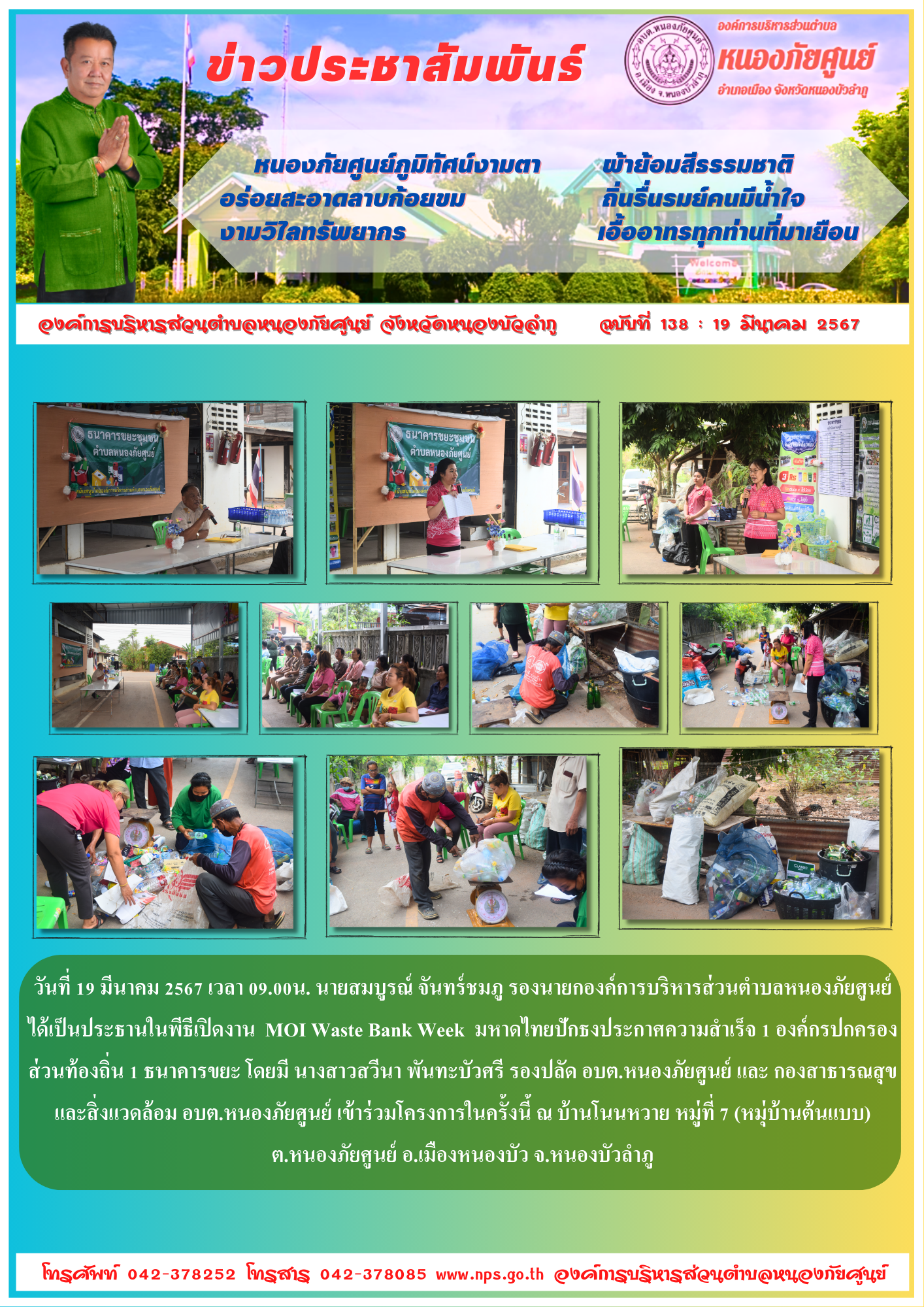วันที่ 19 มีนาคม 2567 เวลา 09.00น. นายสมบูรณ์ จันทร์ชมภู รองนายกองค์การบริหารส่วนตำบลหนองภัยศูนย์ ได้เป็นประธานในพีธีเปิดงาน MOI Waste Bank Week มหาดไทยปักธงประกาศความสำเร็จ 1 องค์กรปกครองส่วนท้องถิ่น 1 ธนาคารขยะ โดยมี นางสาวสวีนา... [19 มีนาคม 2567]
