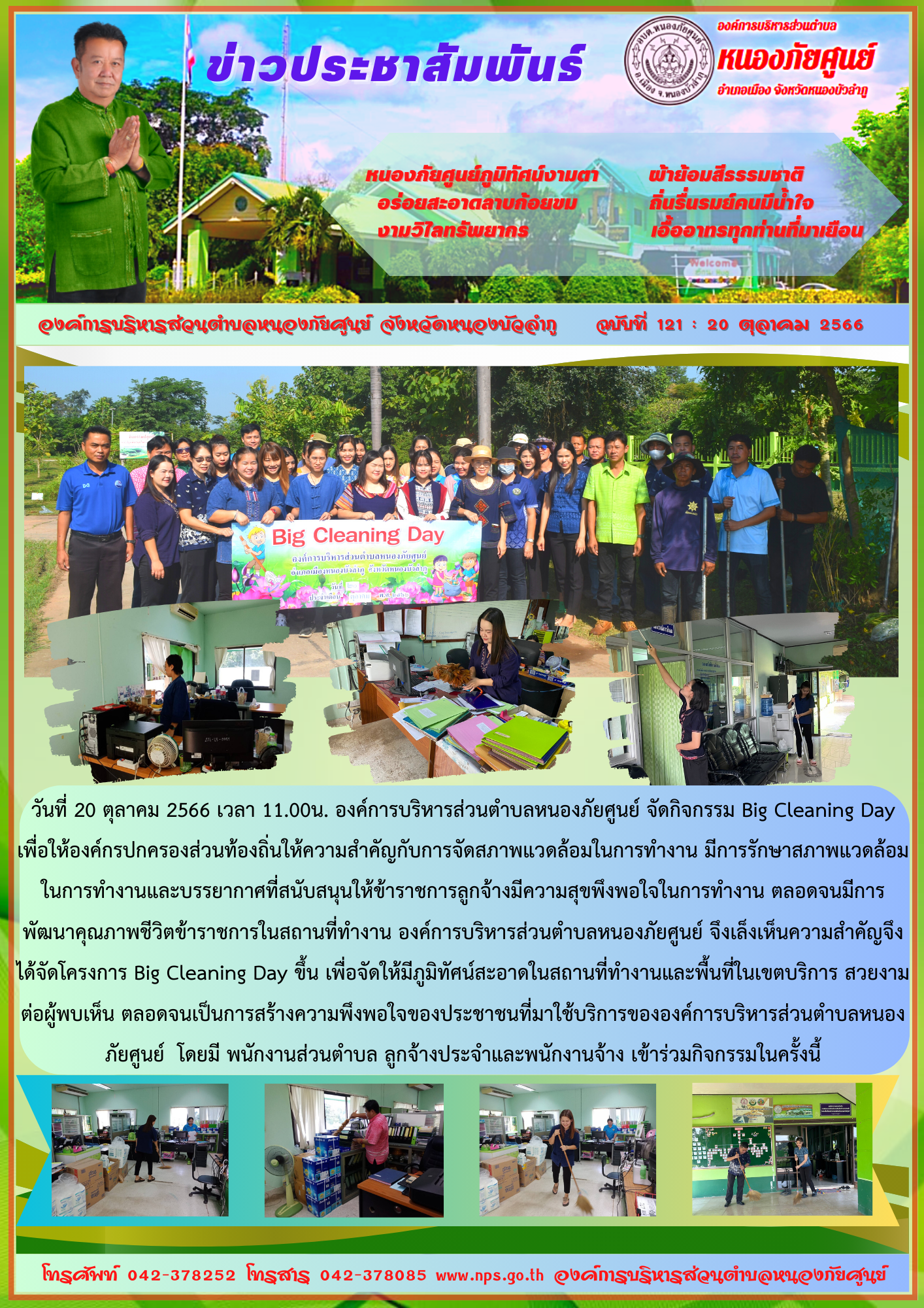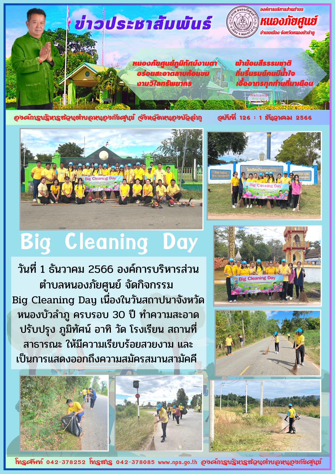 วันที่ 1 ธันวาคม 2566 องค์การบริหารส่วนตำบลหนองภัยศูนย์ จัดกิจกรรม Big Cleaning Day เนื่องในวันสถาปนาจังหวัดหนองบัวลำภู ครบรอบ 30 ปี ทำความสะอาดปรับปรุง ภูมิทัศน์ อาทิ วัด โรงเรียน สถานที่สาธารณะ ให้มีความเรียบร้อยสวยงาม... [4 ธันวาคม 2566]