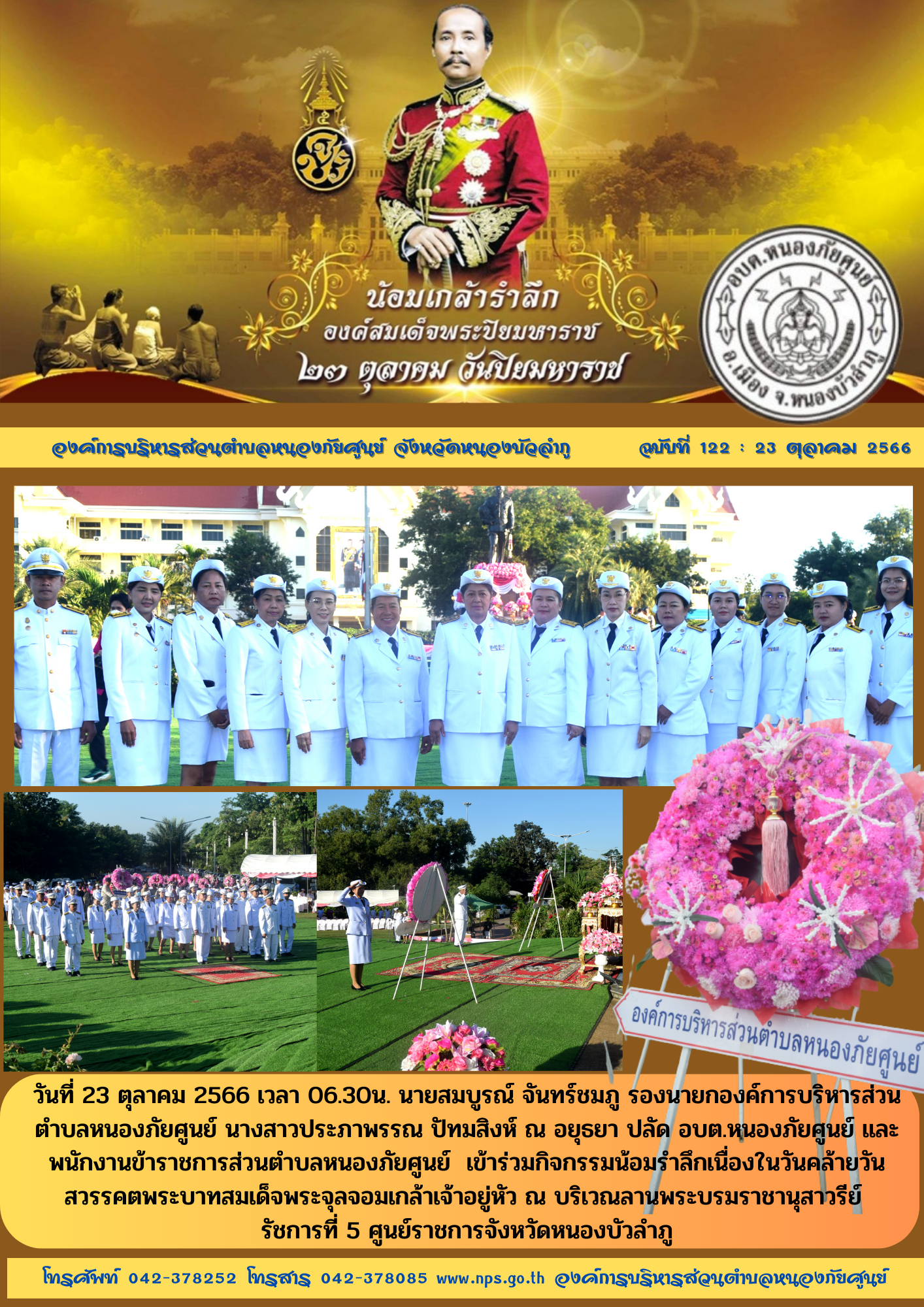 วันที่ 23 ตุลาคม 2566 เวลา 06.30น. นายสมบูรณ์ จันทร์ชมภู รองนายกองค์การบริหารส่วนตำบลหนองภัยศูนย์ นางสาวประภาพรรณ ปัทมสิงห์ ณ อยุธยา ปลัด อบต.หนองภัยศูนย์ และ พนักงานข้าราชการส่วนตำบลหนองภัยศูนย์ ... [24 ตุลาคม 2566]