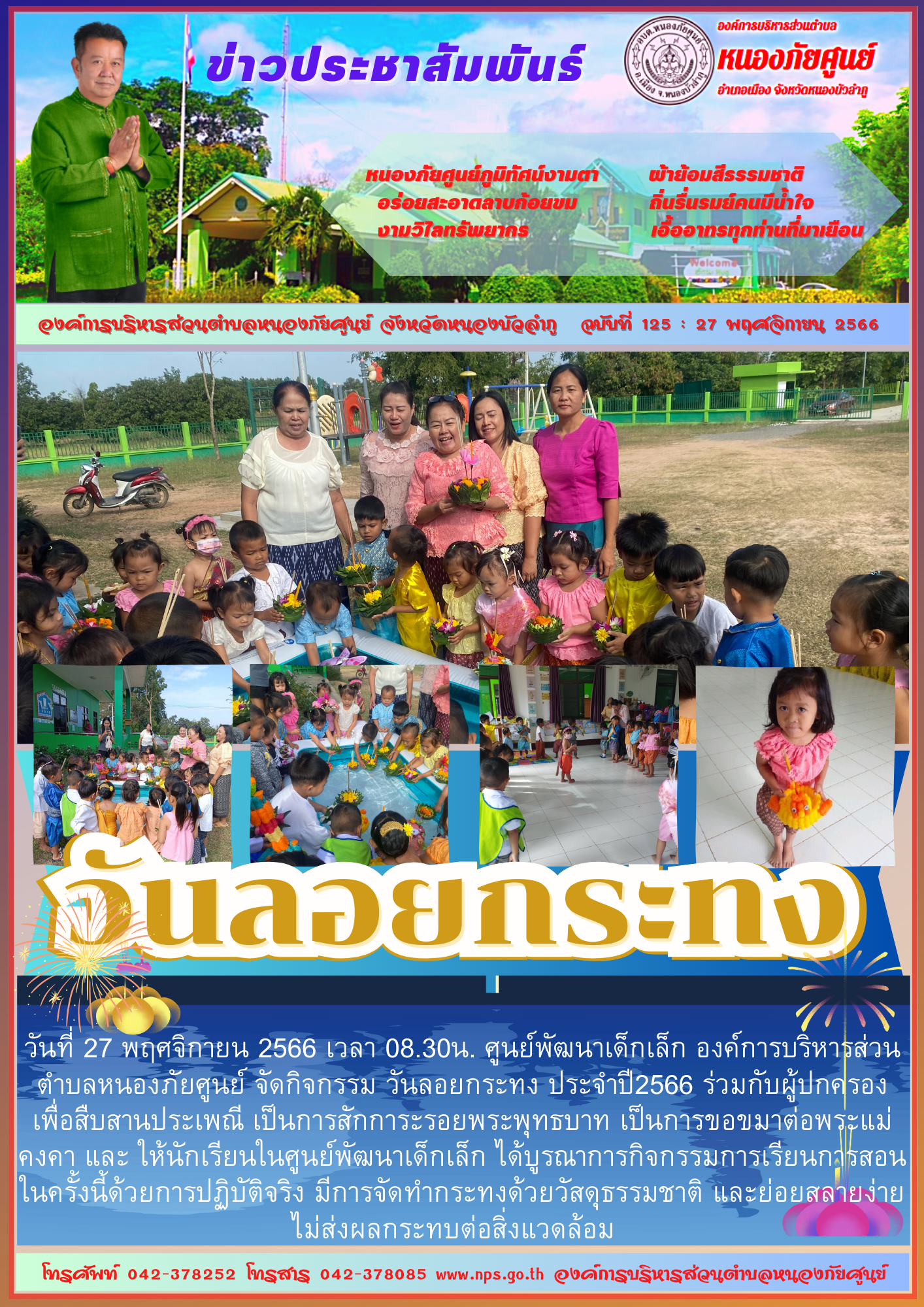 วันที่ 27 พฤศจิกายน 2566 เวลา 08.30น. ศูนย์พัฒนาเด็กเล็ก องค์การบริหารส่วนตำบลหนองภัยศูนย์ จัดกิจกรรม วันลอยกระทง ประจำปี2566 ร่วมกับผู้ปกครอง เพื่อสืบสานประเพณี เป็นการสักการะรอยพระพุทธบาท เป็นการขอขมาต่อพระแม่คงคา และ... [27 พฤศจิกายน 2566]