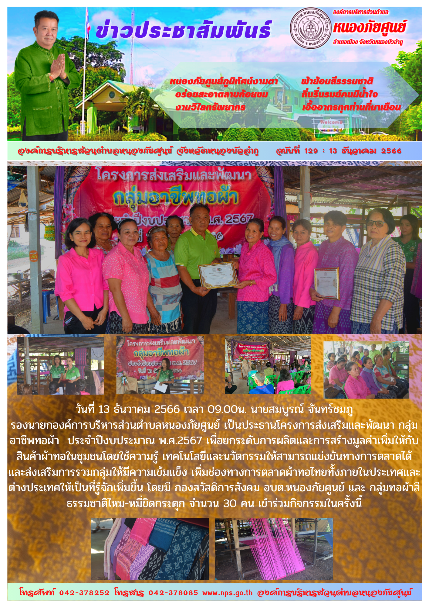 วันที่ 13 ธันวาคม 2566 เวลา 09.00น. นายสมบูรณ์ จันทร์ชมภู รองนายกองค์การบริหารส่วนตำบลหนองภัยศูนย์ เป็นประธานโครงการส่งเสริมและพัฒนา กลุ่มอาชีพทอผ้า ประจำปีงบประมาณ พ.ศ.2567... [14 ธันวาคม 2566]
