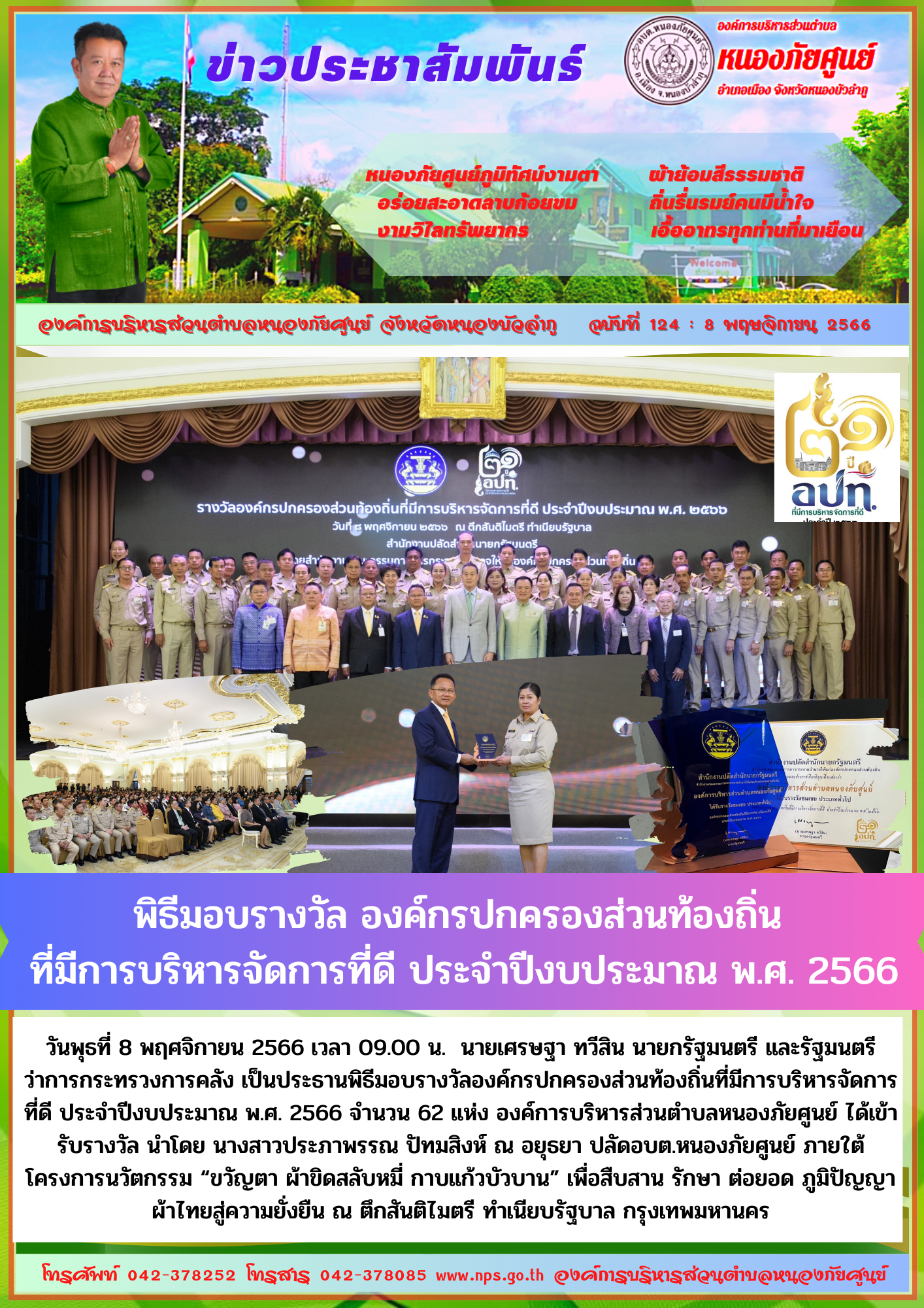 วันพุธที่ 8 พฤศจิกายน 2566 เวลา 09.00 น. นายเศรษฐา ทวีสิน นายกรัฐมนตรี และรัฐมนตรีว่าการกระทรวงการคลัง เป็นประธานพิธีมอบรางวัลองค์กรปกครองส่วนท้องถิ่นที่มีการบริหารจัดการที่ดี ประจำปีงบประมาณ พ.ศ. 2566 จำนวน 62 แห่ง... [15 พฤศจิกายน 2566]