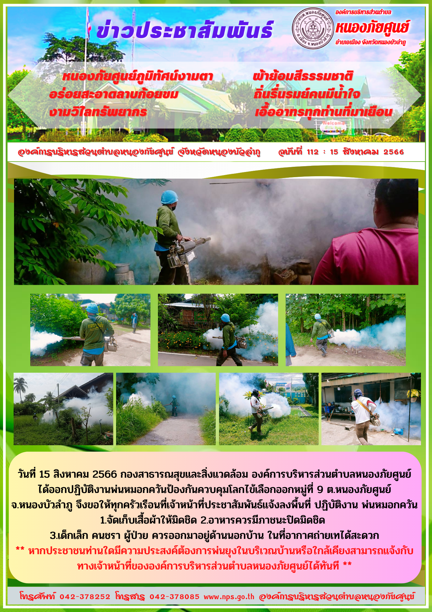 วันที่ 15 สิงหาคม 2566 กองสาธารณสุขและสิ่งแวดล้อม องค์การบริหารส่วนตำบลหนองภัยศูนย์ ได้ออกปฏิบัติงานพ่นหมอกควันป้องกันควบคุมโลกไข้เลือกออกหมู่ที่ 9 ต.หนองภัยศูนย์ จ.หนองบัวลำภู... [15 สิงหาคม 2566]