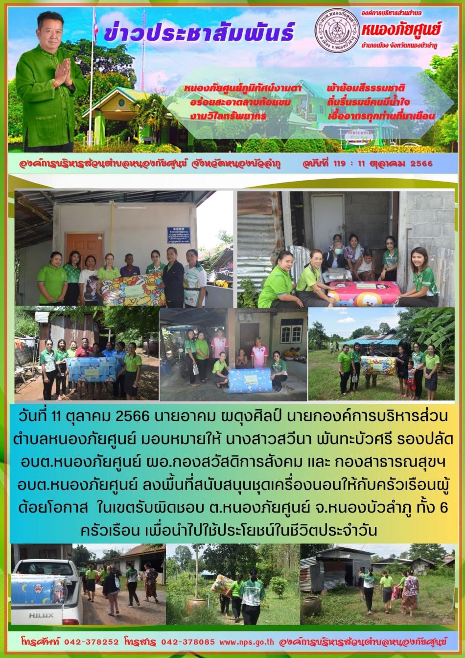 วันที่ 11 ตุลาคม 2566 นายอาคม ผดุงศิลป์ นายกองค์การบริหารส่วนตำบลหนองภัยศูนย์ มอบหมายให้ นางสาวสวีนา พันทะบัวศรี รองปลัด อบต.หนองภัยศูนย์ ผอ.กองสวัสดิการสังคม และ กองสาธารณสุขฯ อบต.หนองภัยศูนย์... [11 ตุลาคม 2566]