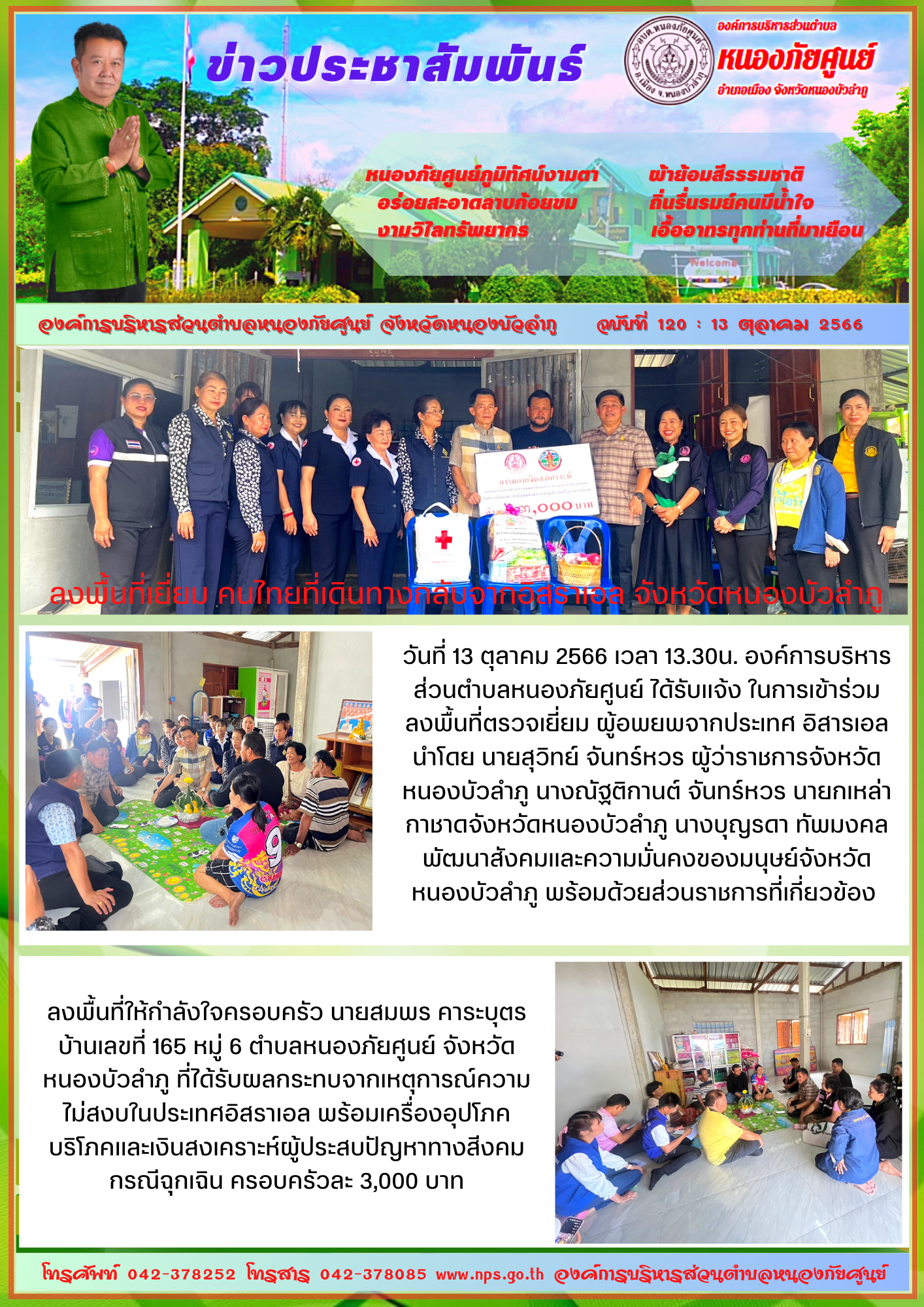 วันที่ 13 ตุลาคม 2566 เวลา 13.30น. องค์การบริหารส่วนตำบลหนองภัยศูนย์ ได้รับแจ้ง ในการเข้าร่วมลงพื้นที่ตรวจเยี่ยม ผู้อพยพจากประเทศ อิสารเอล นำโดย นายสุวิทย์ จันทร์หวร ผู้ว่าราชการจังหวัดหนองบัวลำภู นางณัฐติกานต์... [16 ตุลาคม 2566]