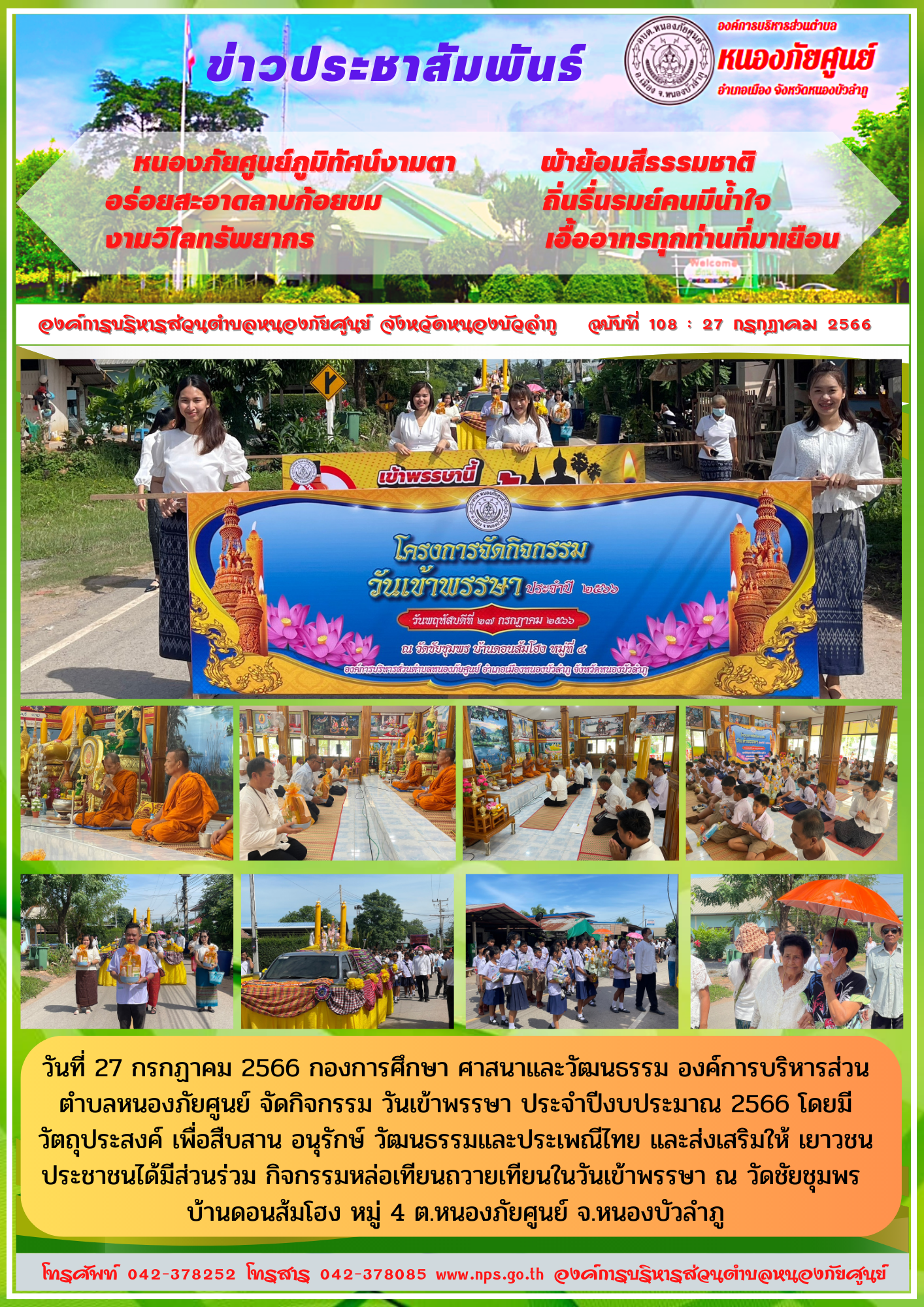 วันที่ 27 กรกฏาคม 2566 กองการศึกษา ศาสนาและวัฒนธรรม องค์การบริหารส่วนตำบลหนองภัยศูนย์ จัดกิจกรรม วันเข้าพรรษา ประจำปีงบประมาณ 2566 โดยมีวัตถุประสงค์ เพื่อสืบสาน อนุรักษ์ วัฒนธรรมและประเพณีไทย และส่งเสริมให้ เยาวชน... [27 กรกฎาคม 2566]