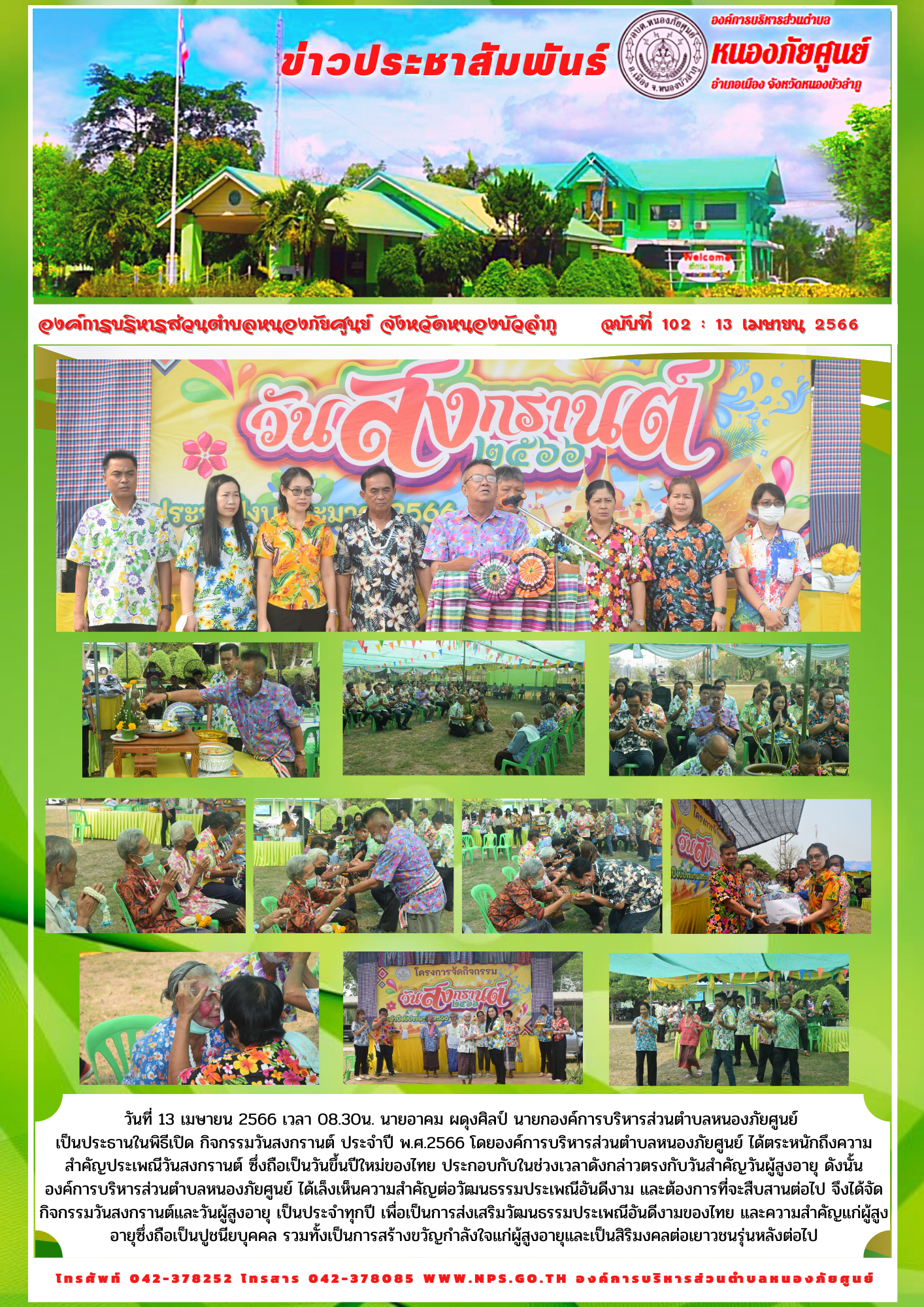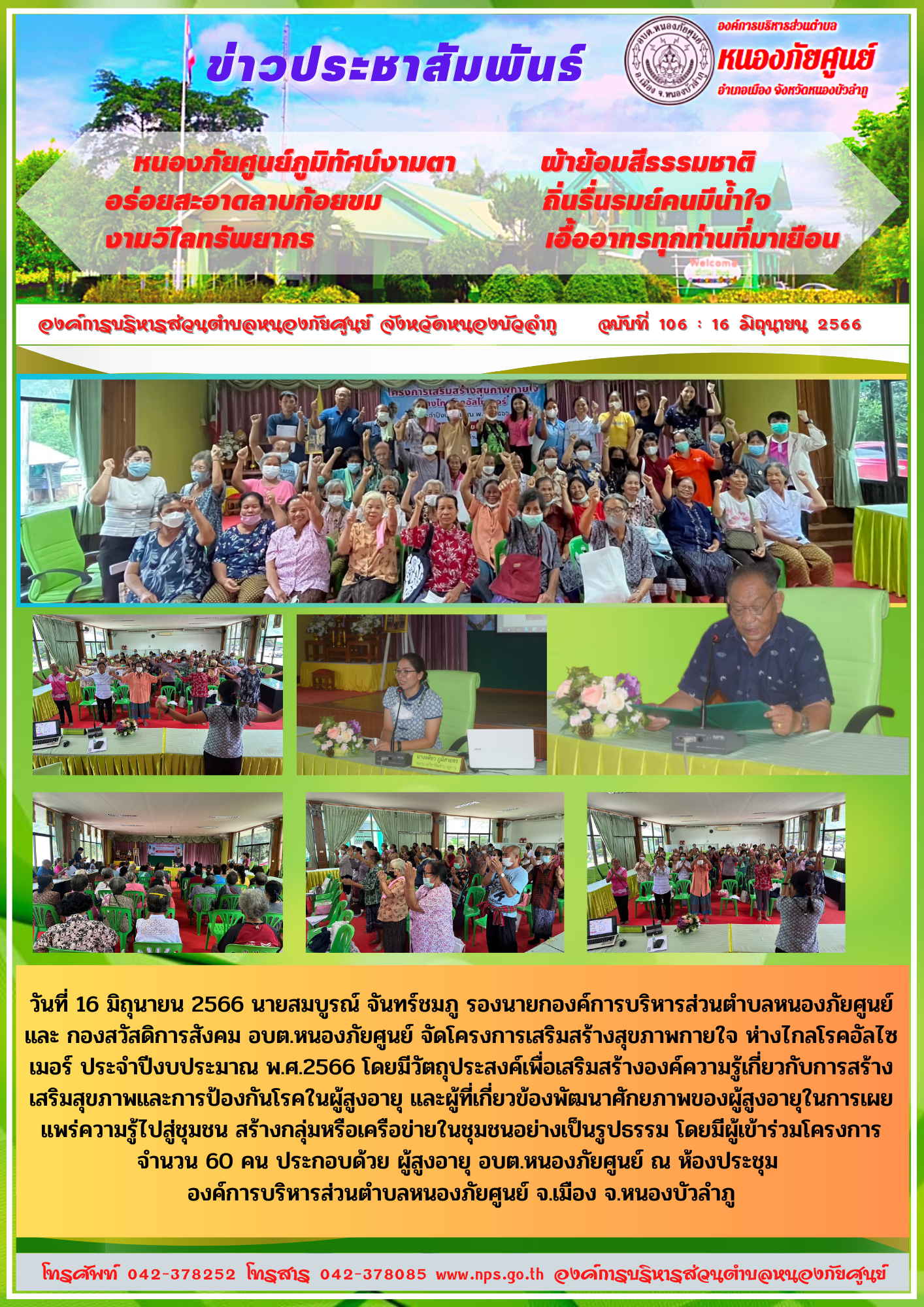 วันที่ 16 มิถุนายน 2566 นายสมบูรณ์ จันทร์ชมภู รองนายกองค์การบริหารส่วนตำบลหนองภัยศูนย์และ กองสวัสดิการสังคม อบต.หนองภัยศูนย์ จัดโครงการเสริมสร้างสุขภาพกายใจ ห่างไกลโรคอัลไซเมอร์ ประจำปีงบประมาณ พ.ศ.2566... [16 มิถุนายน 2566]