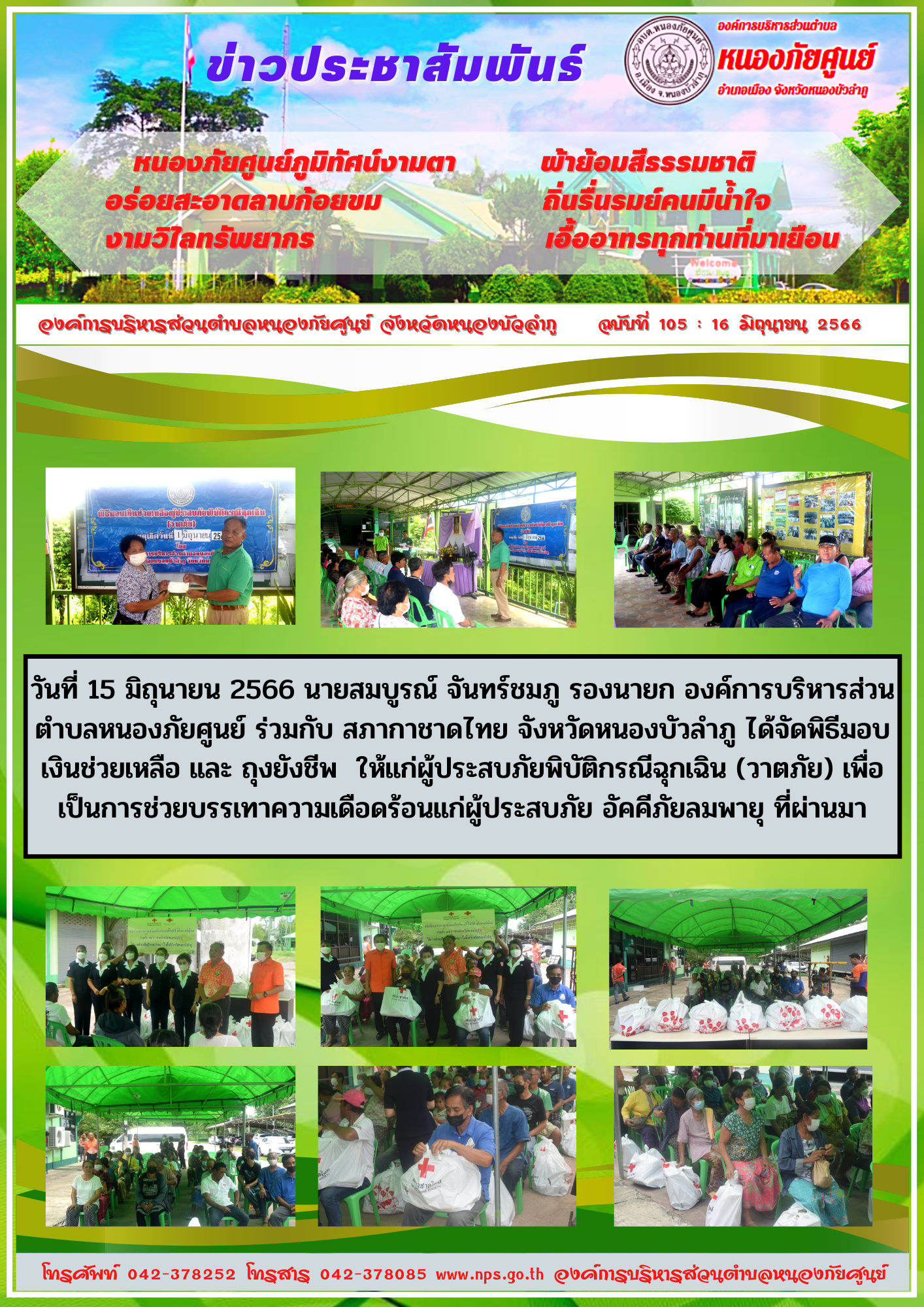 วันที่ 15 มิถุนายน 2566 นายสมบูรณ์ จันทร์ชมภู รองนายก องค์การบริหารส่วนตำบลหนองภัยศูนย์ ร่วมกับ สภากาชาดไทย จังหวัดหนองบัวลำภู ได้จัดพิธีมอบ เงินช่วยเหลือ และ ถุงยังชีพ ให้แก่ผู้ประสบภัยพิบัติกรณีฉุกเฉิน (วาตภัย)... [16 มิถุนายน 2566]