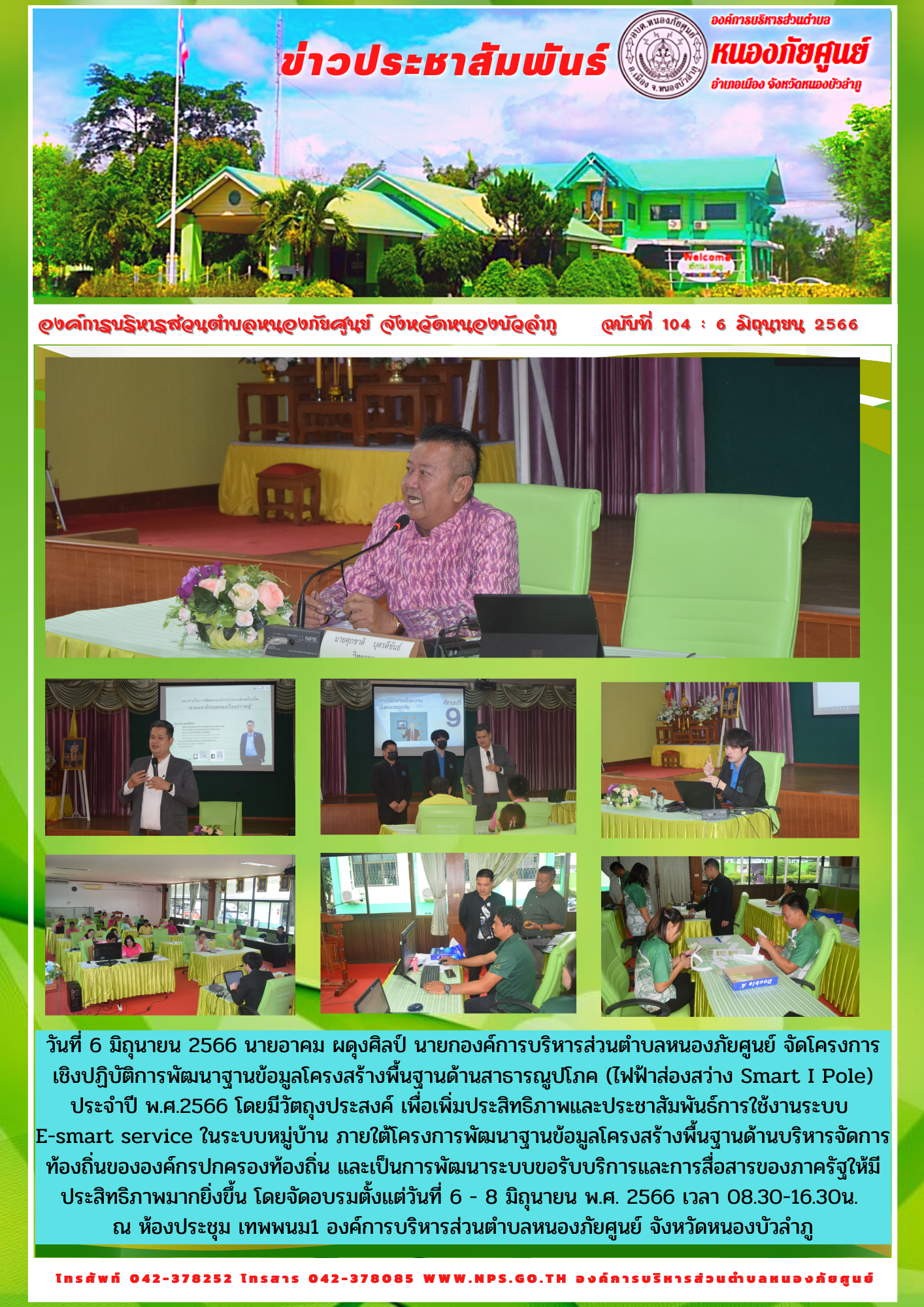 วันที่ 6 มิถุนายน 2566 นายอาคม ผดุงศิลป์ นายกองค์การบริหารส่วนตำบลหนองภัยศูนย์ จัดโครงการเชิงปฏิบัติการพัฒนาฐานข้อมูลโครงสร้างพื้นฐานด้านสาธารณูปโภค (ไฟฟ้าส่องสว่าง Smart I Pole) ประจำปี พ.ศ.2566 โดยมีวัตถุงประสงค์... [8 มิถุนายน 2566]