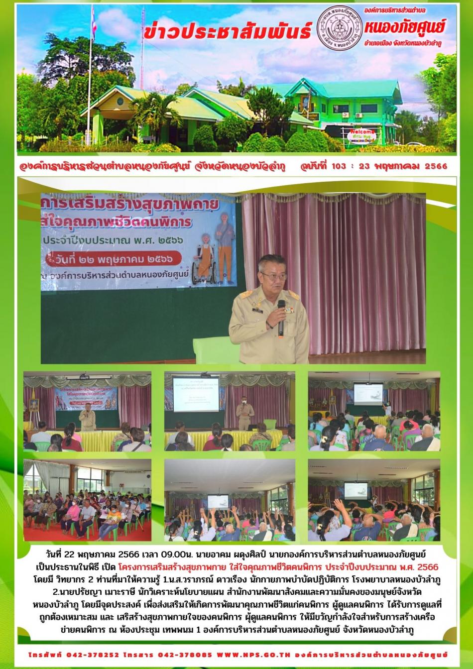 วันที่ 22 พฤษภาคม 2566 เวลา 09.00น. นายอาคม ผดุงศิลป์ นายกองค์การบริหารส่วนตำบลหนองภัยศูนย์ เป็นประธานในพิธี เปิด โครงการเสริมสร้างสุขภาพกาย ใส่ใจคุณภาพชีวิตคนพิการ ประจำปีงบประมาณ พ.ศ. 2566 โดยมี วิทยากร 2... [23 พฤษภาคม 2566]